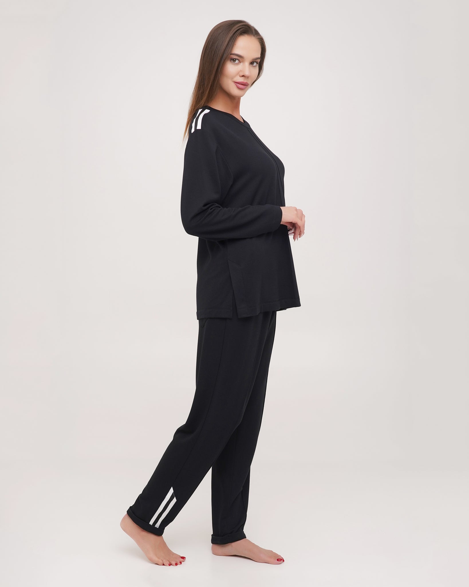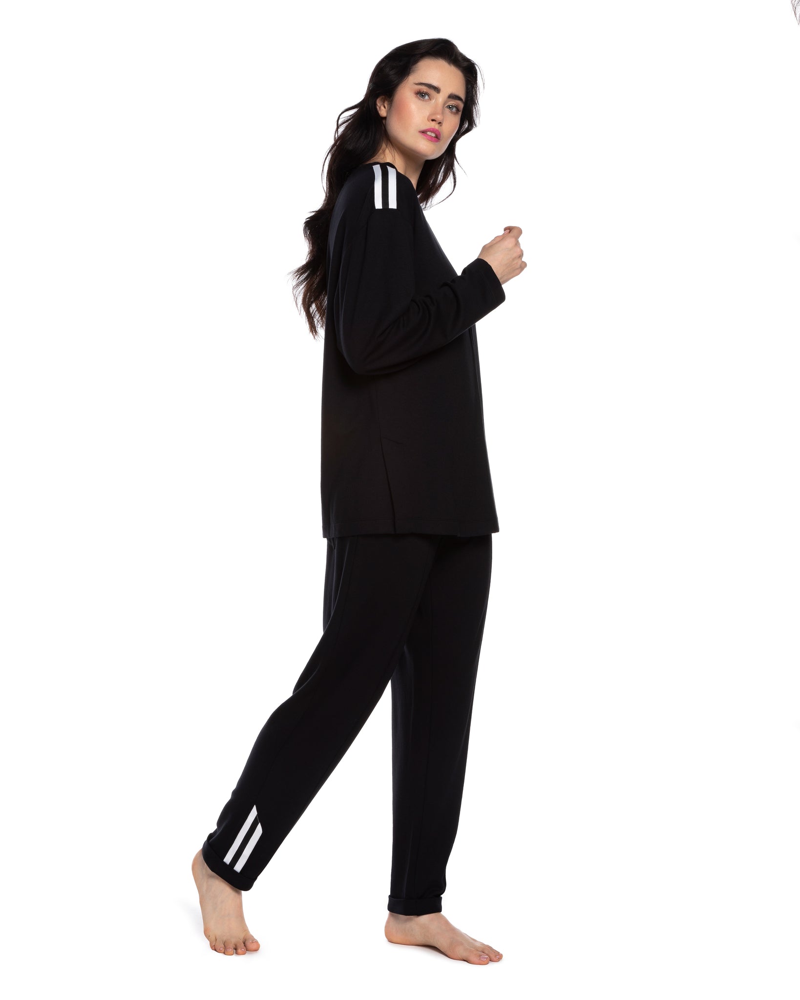 Bottom — tapered full-length trousers with an elasticated waistband; two white parallel stripes on the cuff echo the shoulder detail and complete the look as a unified composition.