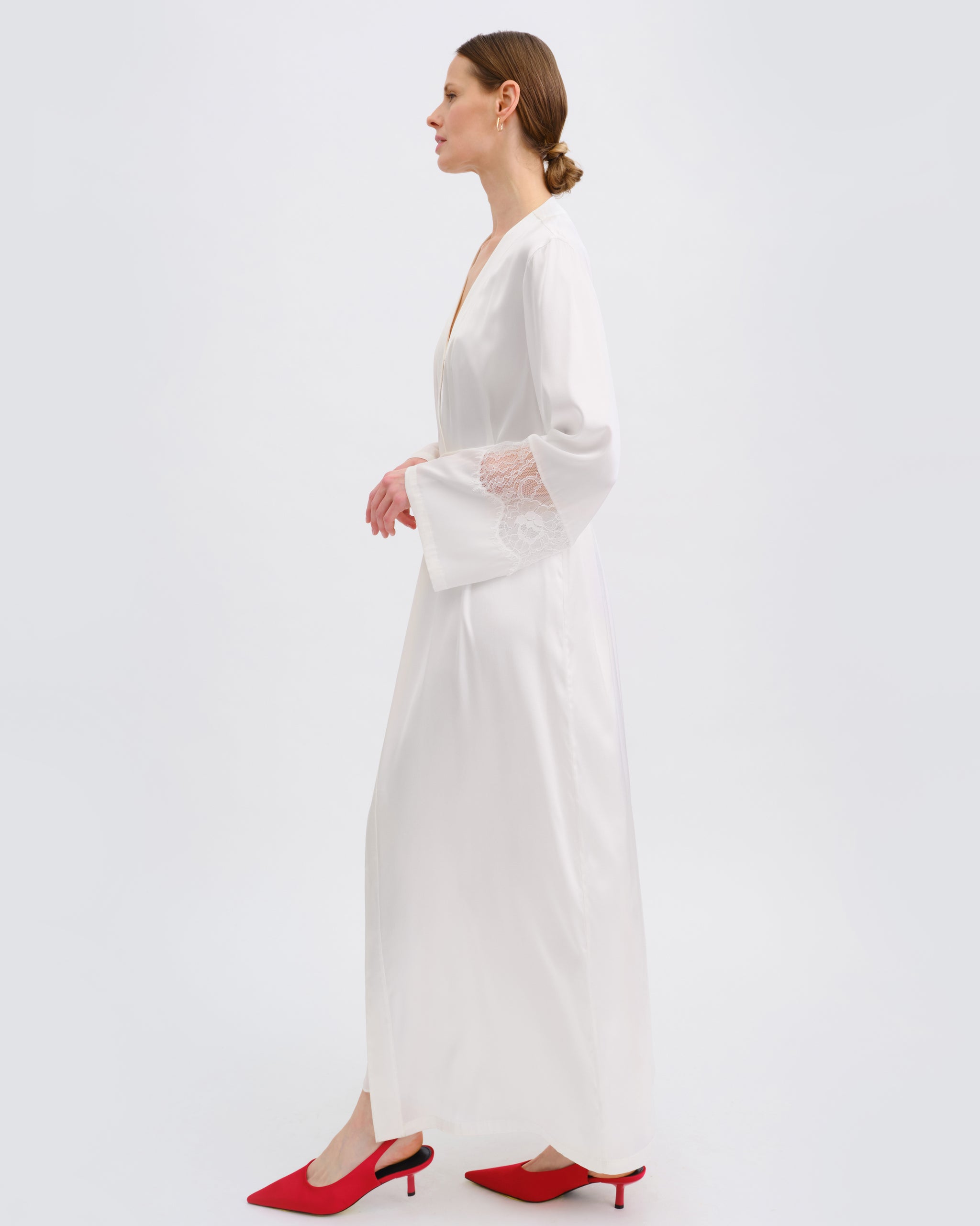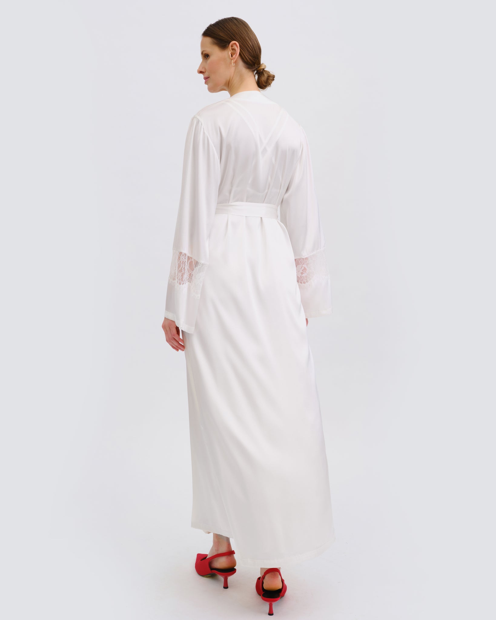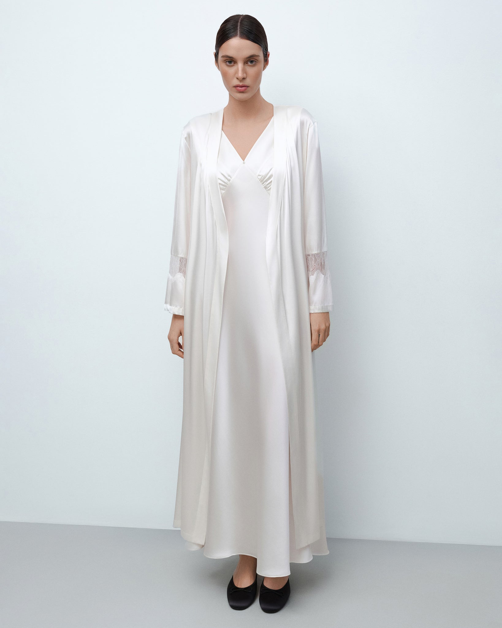Silhouette — a straight wrap-style silhouette with a soft shoulder line and a relaxed fit, creating a refined vertical line. A deep V-shaped neckline delicately accentuates the neck and collarbones. The model is complemented by a detachable belt for individual waist adjustment, resulting in an elegant, understatedly sensual look.