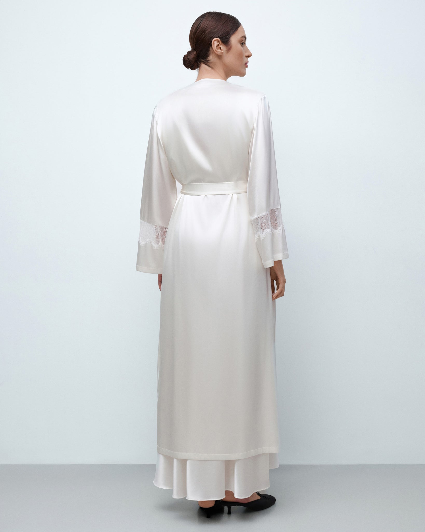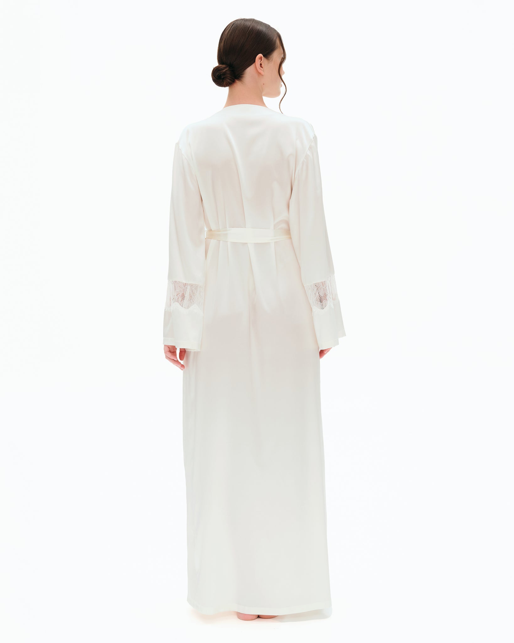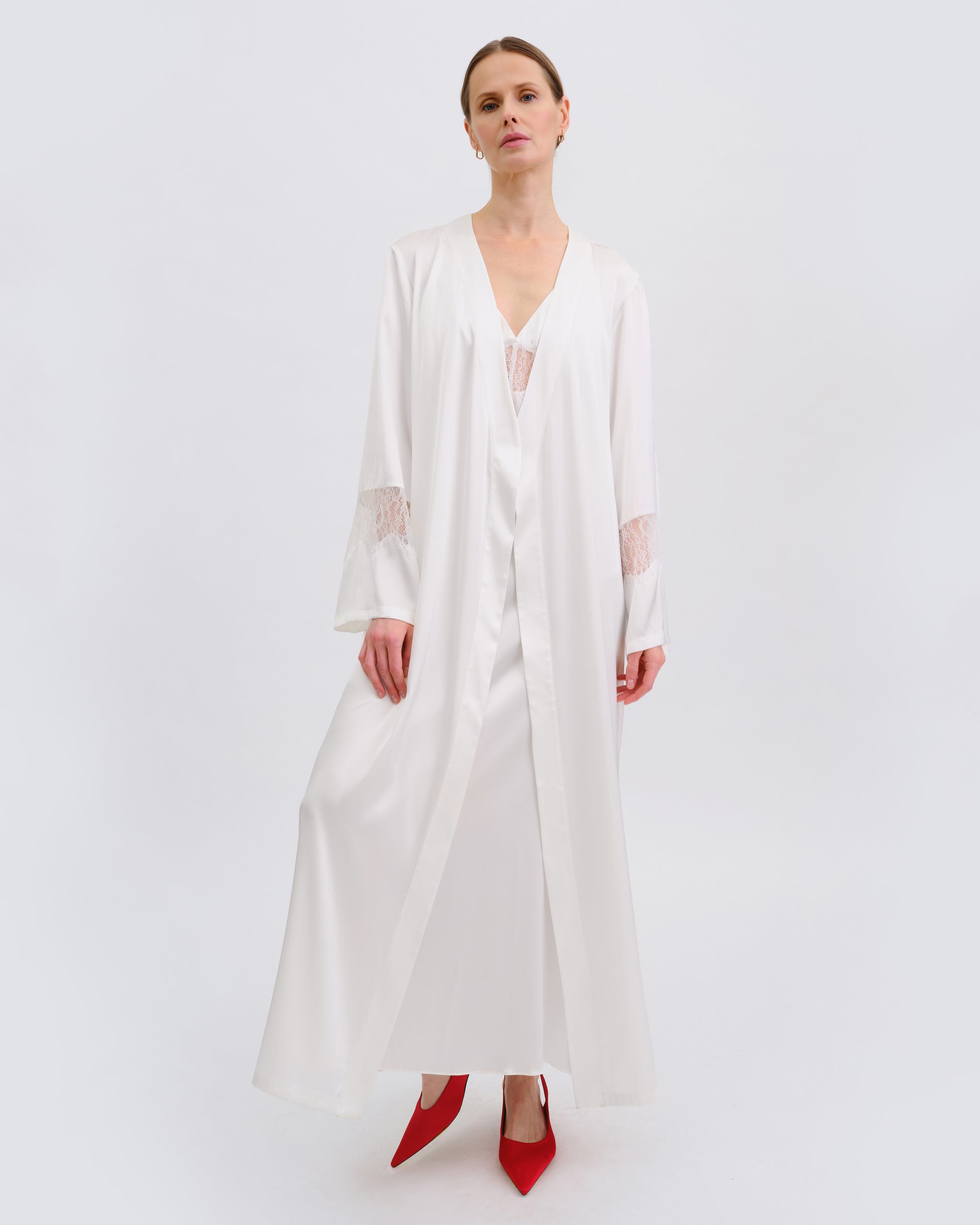 Silhouette — a straight wrap-style silhouette with a soft shoulder line and a relaxed fit, creating a refined vertical line. A deep V-shaped neckline delicately accentuates the neck and collarbones. The model is complemented by a detachable belt for individual waist adjustment, resulting in an elegant, understatedly sensual look.