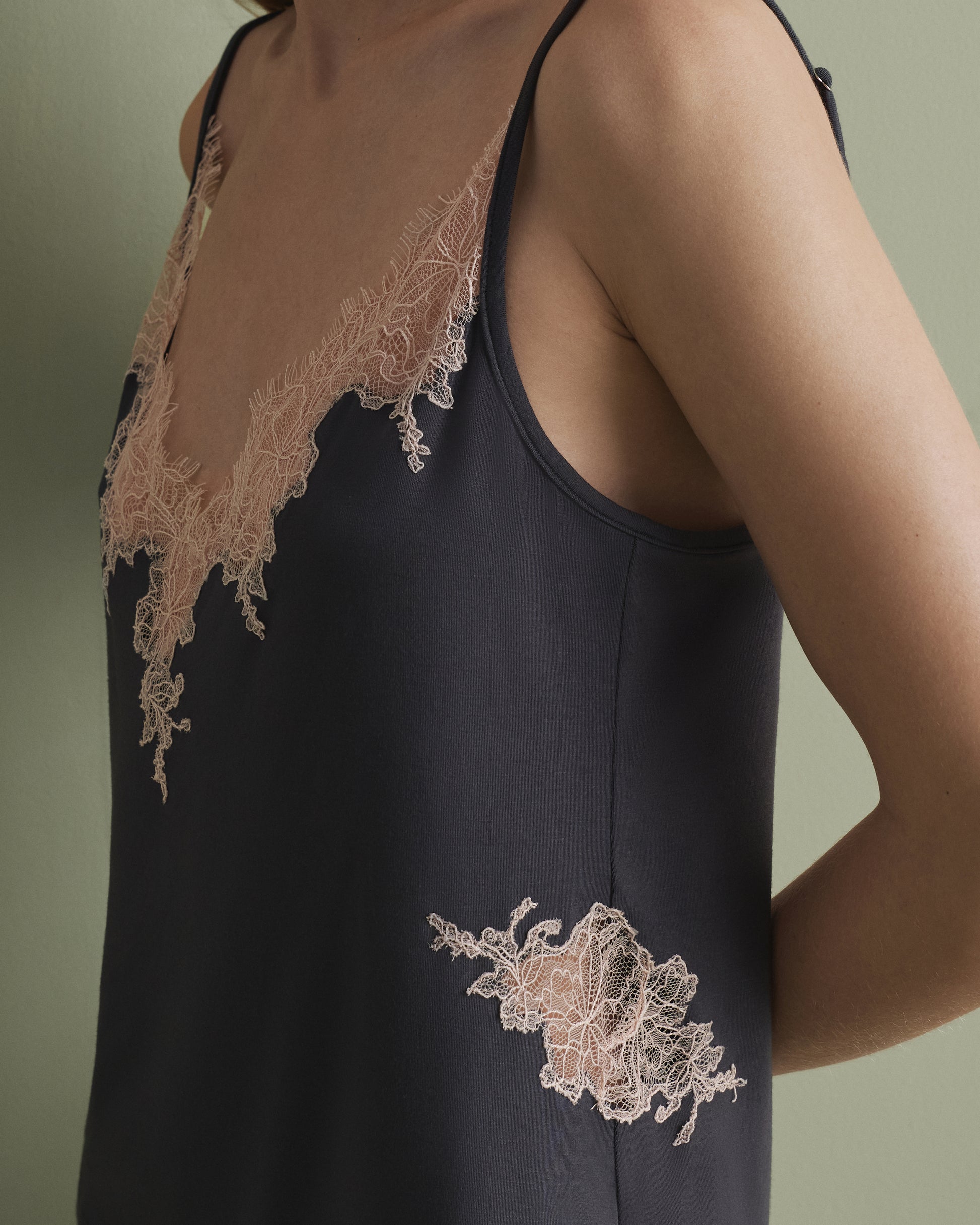 A sophisticated pajama set that seamlessly blends comfort and elegance. The camisole is adorned with exquisite Chantilly lace, delicately hand-applied along the neckline and side inserts, enhancing its refined and feminine appeal. Thin adjustable straps ensure a customized fit, offering both style and ease.