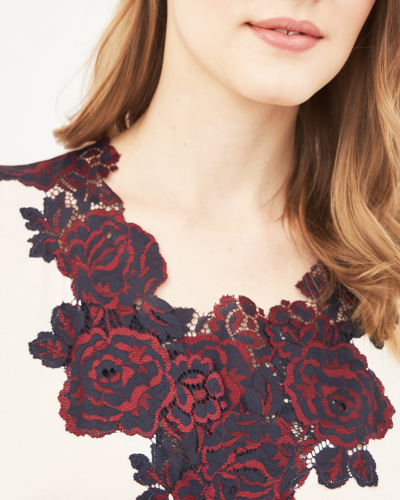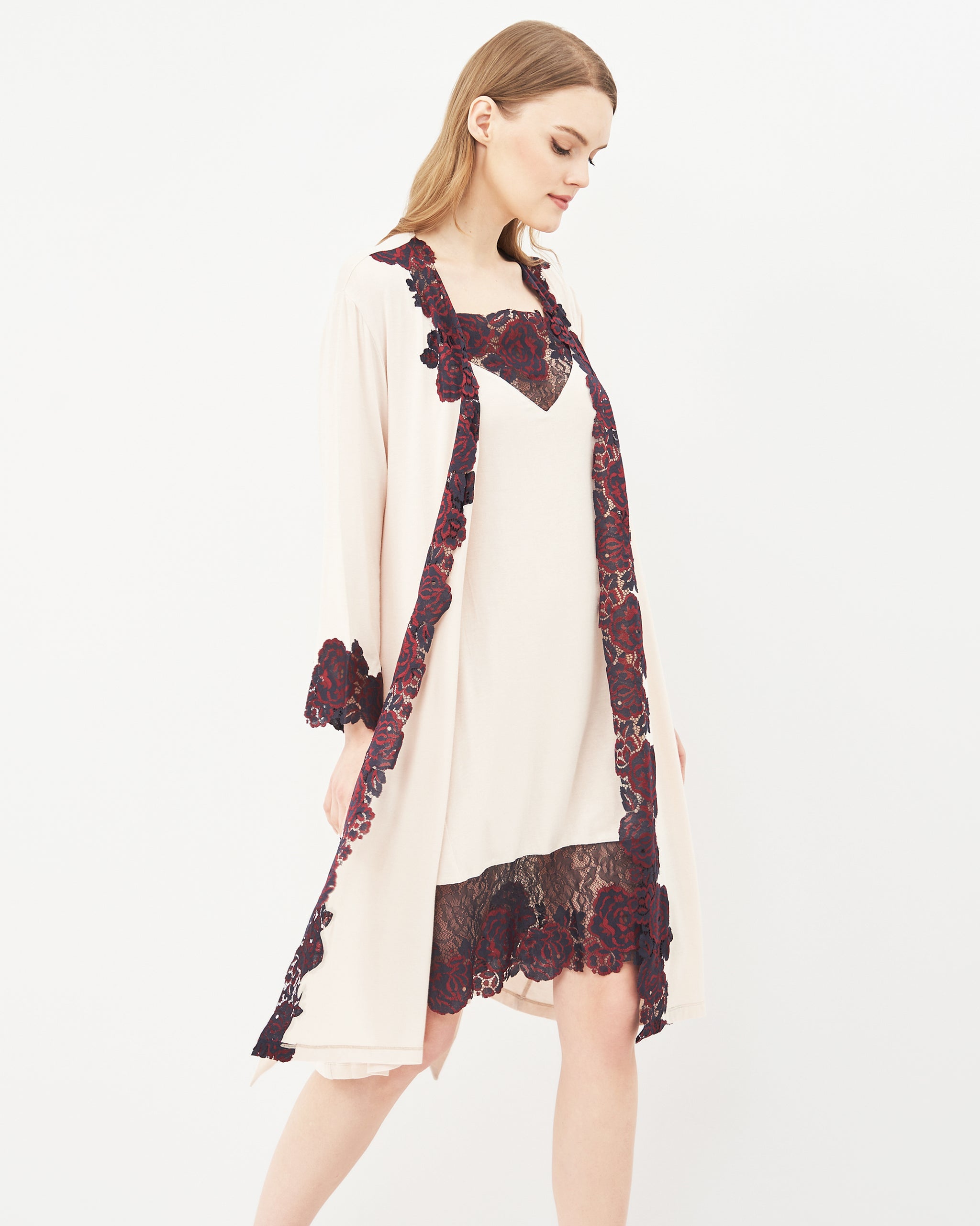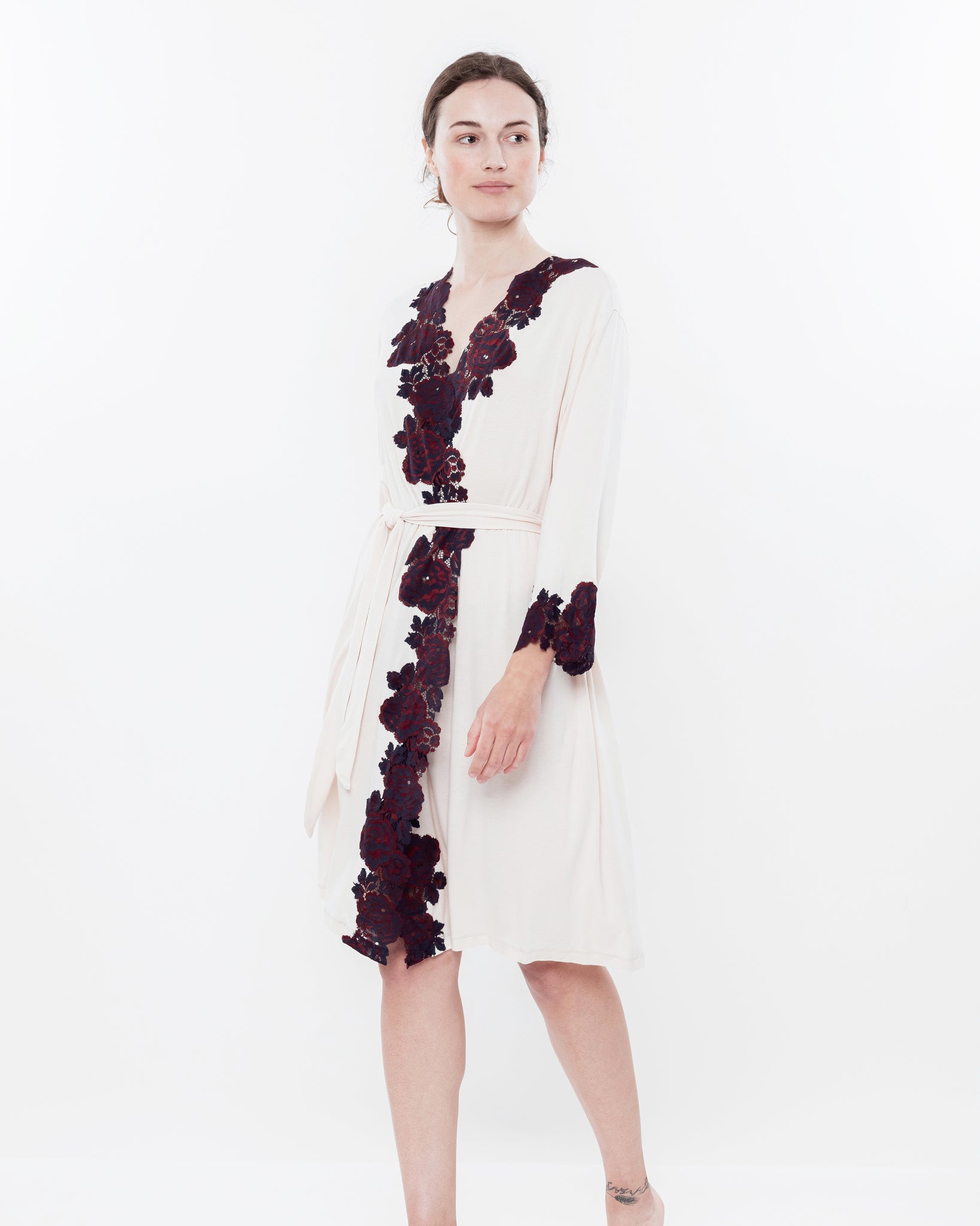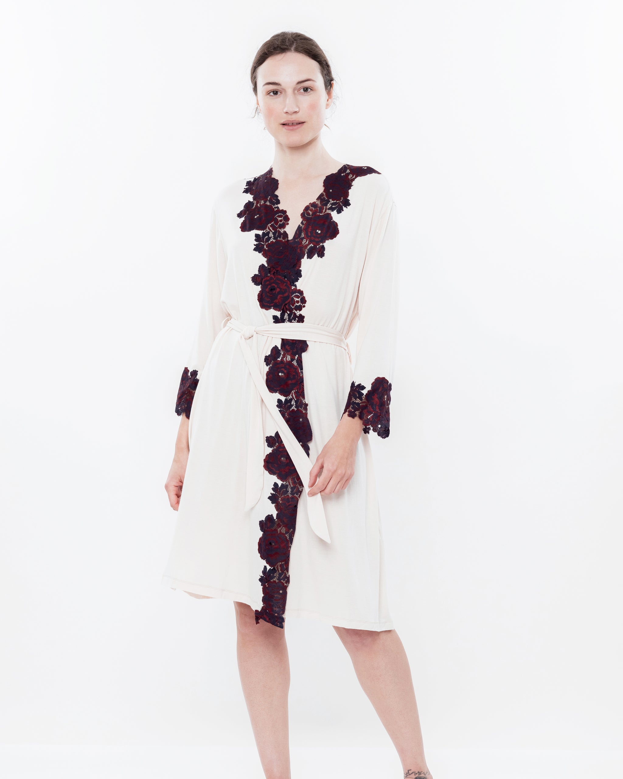 Neckline — a deep V-shaped neckline formed by the wrap design, adorned with a contrasting lace appliqué featuring a luxurious rose motif — a sensual and romantic accent crafted using the Appliqué technique, creating a striking contrast between the soft ecru tone of the fabric and the deep burgundy lace.