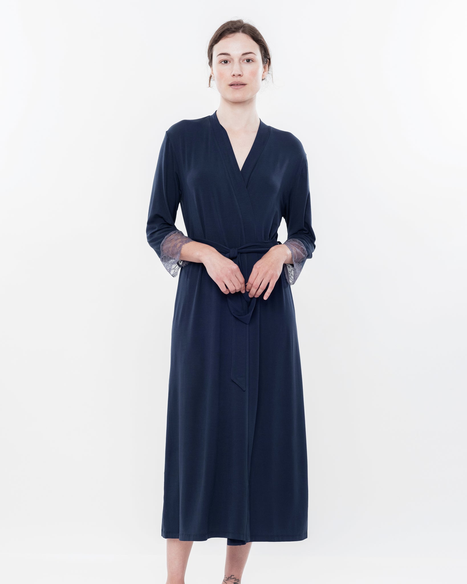 Silhouette — straight wrap-style construction with an elegant maxi-length line that gracefully envelops the figure, offering a sense of calm luxury; the model is complemented by a detachable self-tie belt for individual waist adjustment.