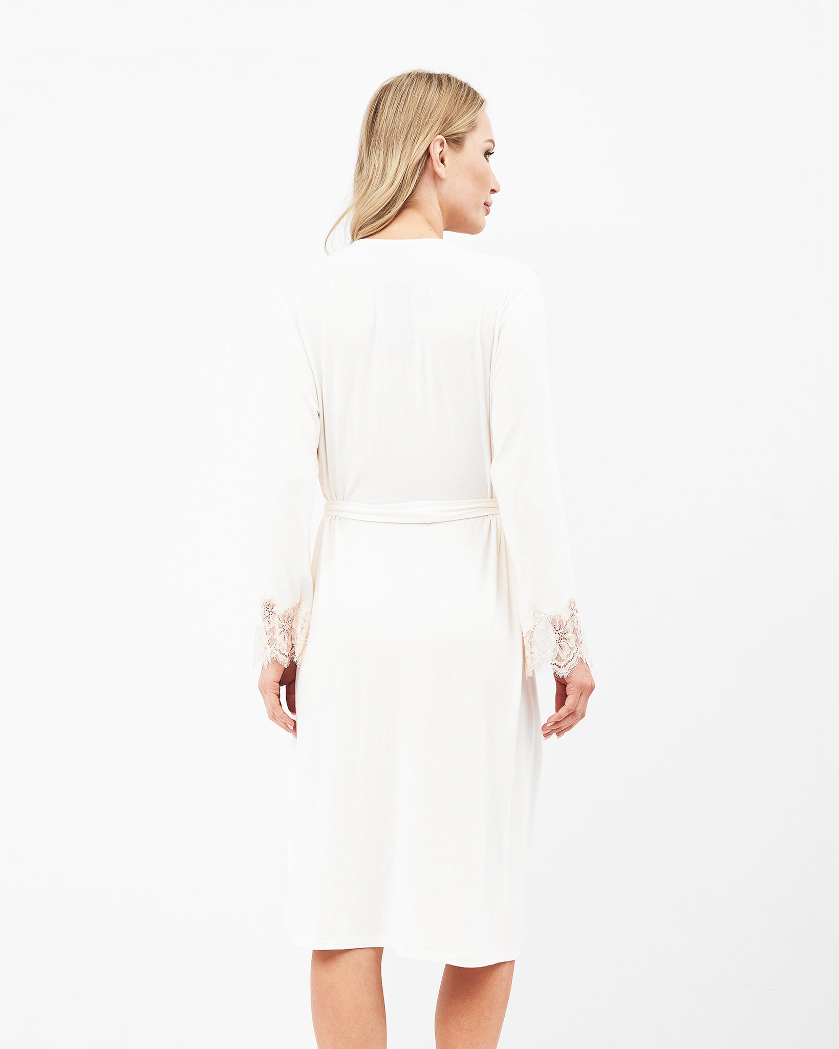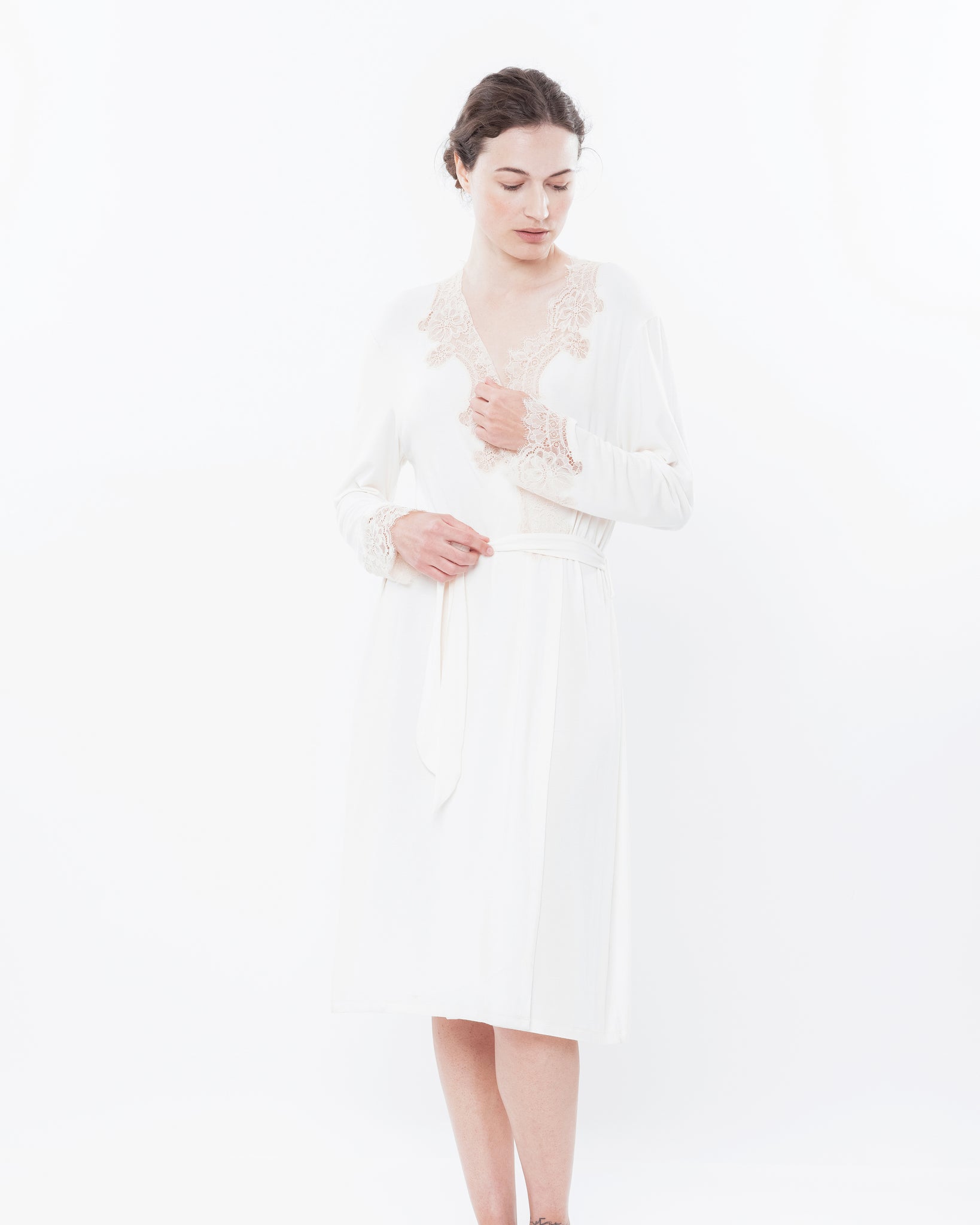 Neckline — a deep V-shaped neckline formed by the wrap design, adorned with a delicate tone-on-tone lace appliqué featuring a lush floral motif that flows gracefully toward the center of the chest — a romantic and sensual accent crafted using the Appliqué technique.