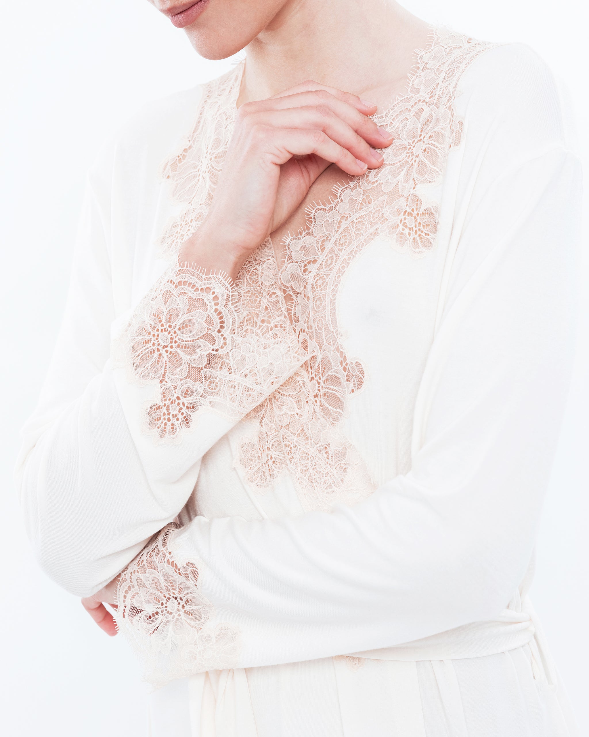 Sleeves — long sleeves with a soft flare toward the cuff; the cuffs are embellished with a delicate tone-on-tone lace appliqué featuring a floral motif and scalloped edge, adding a refined decorative accent that emphasizes the elegant aesthetic of the piece.