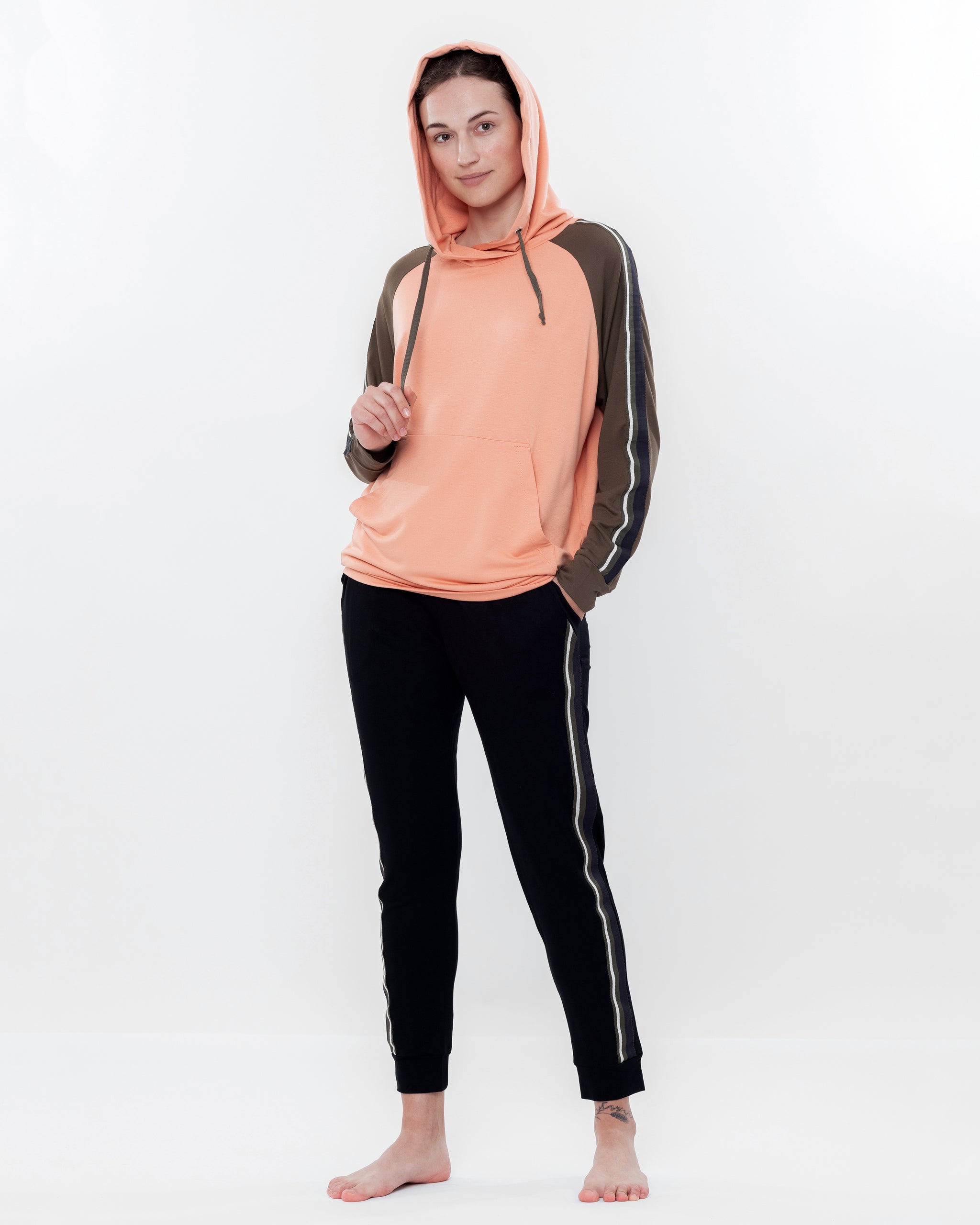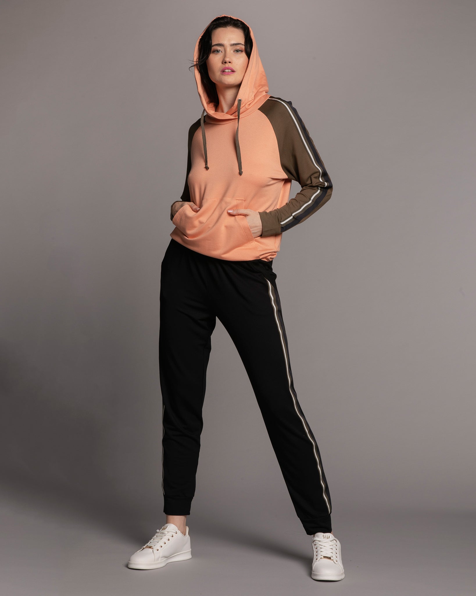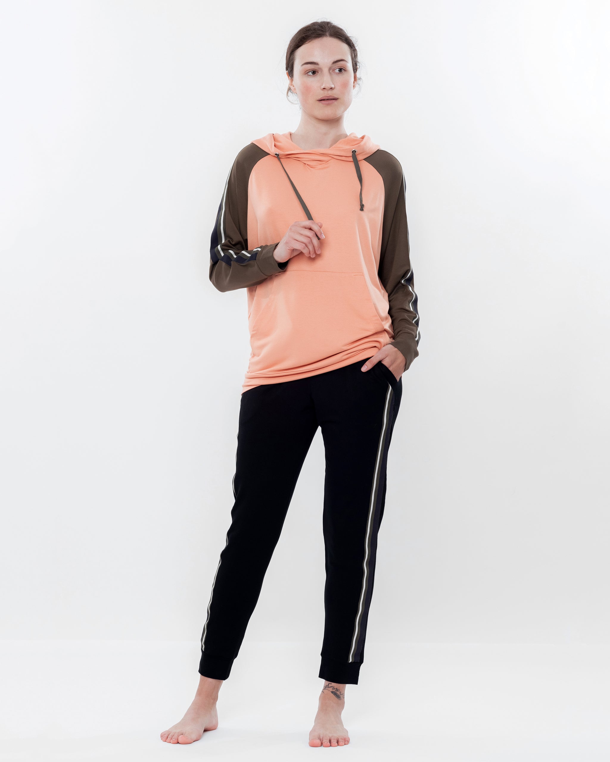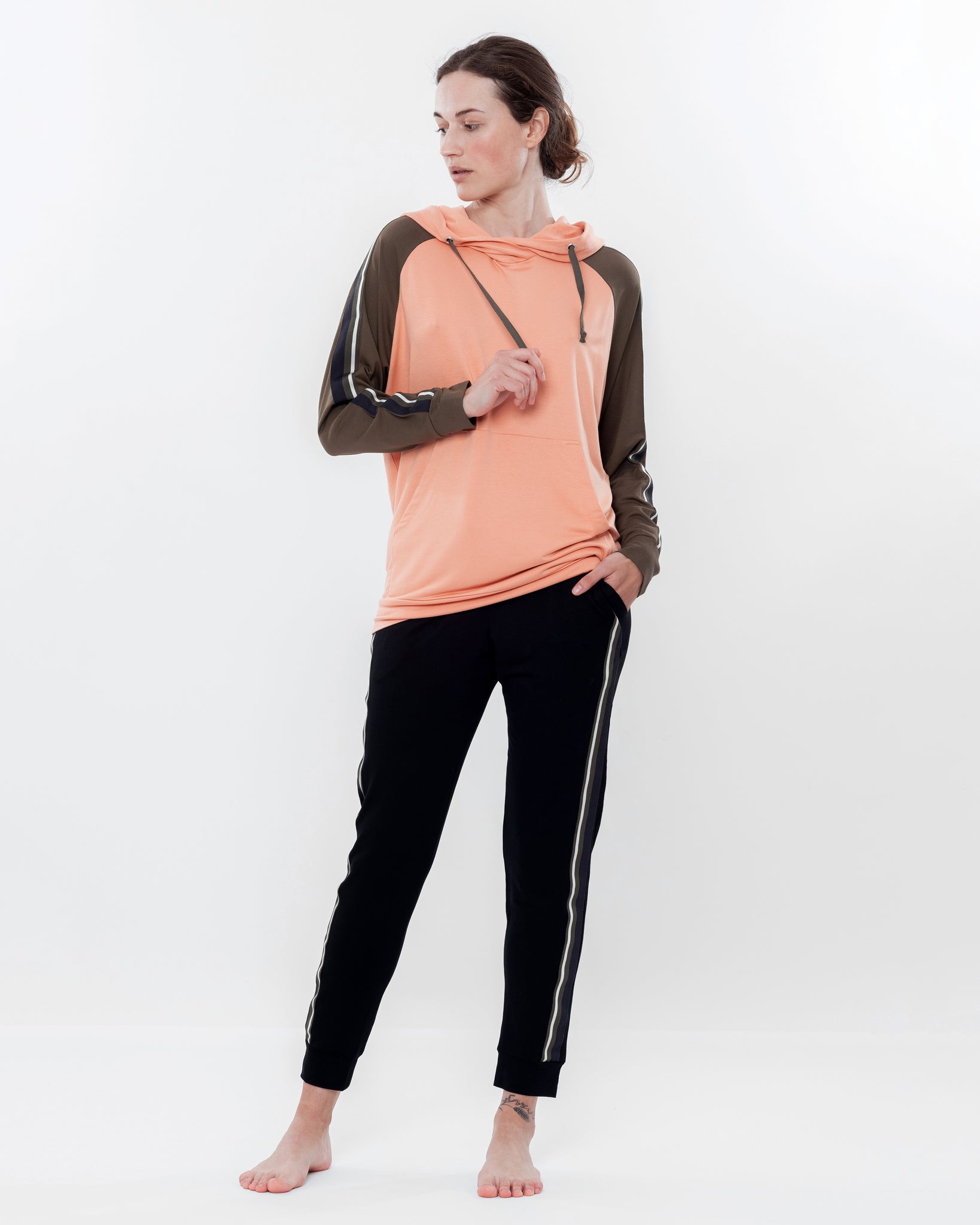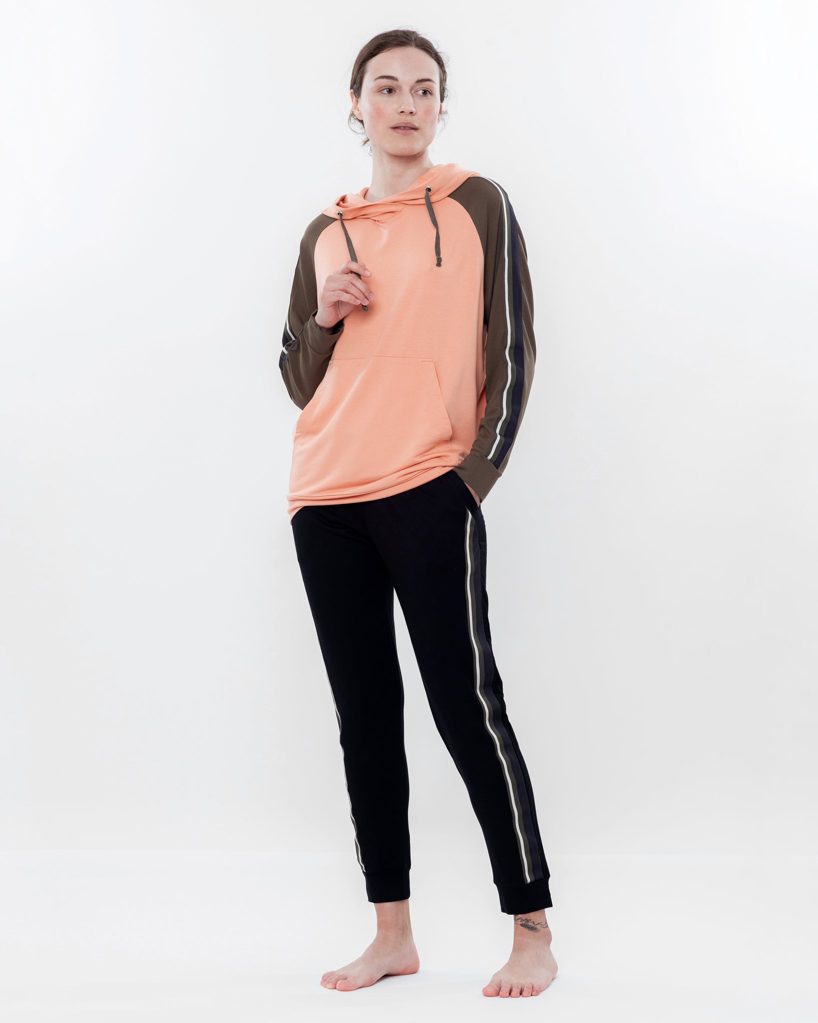 Silhouette — an athleisure-inspired set: a relaxed hoodie paired with tapered joggers, creating a dynamic and effortlessly stylish look for home.