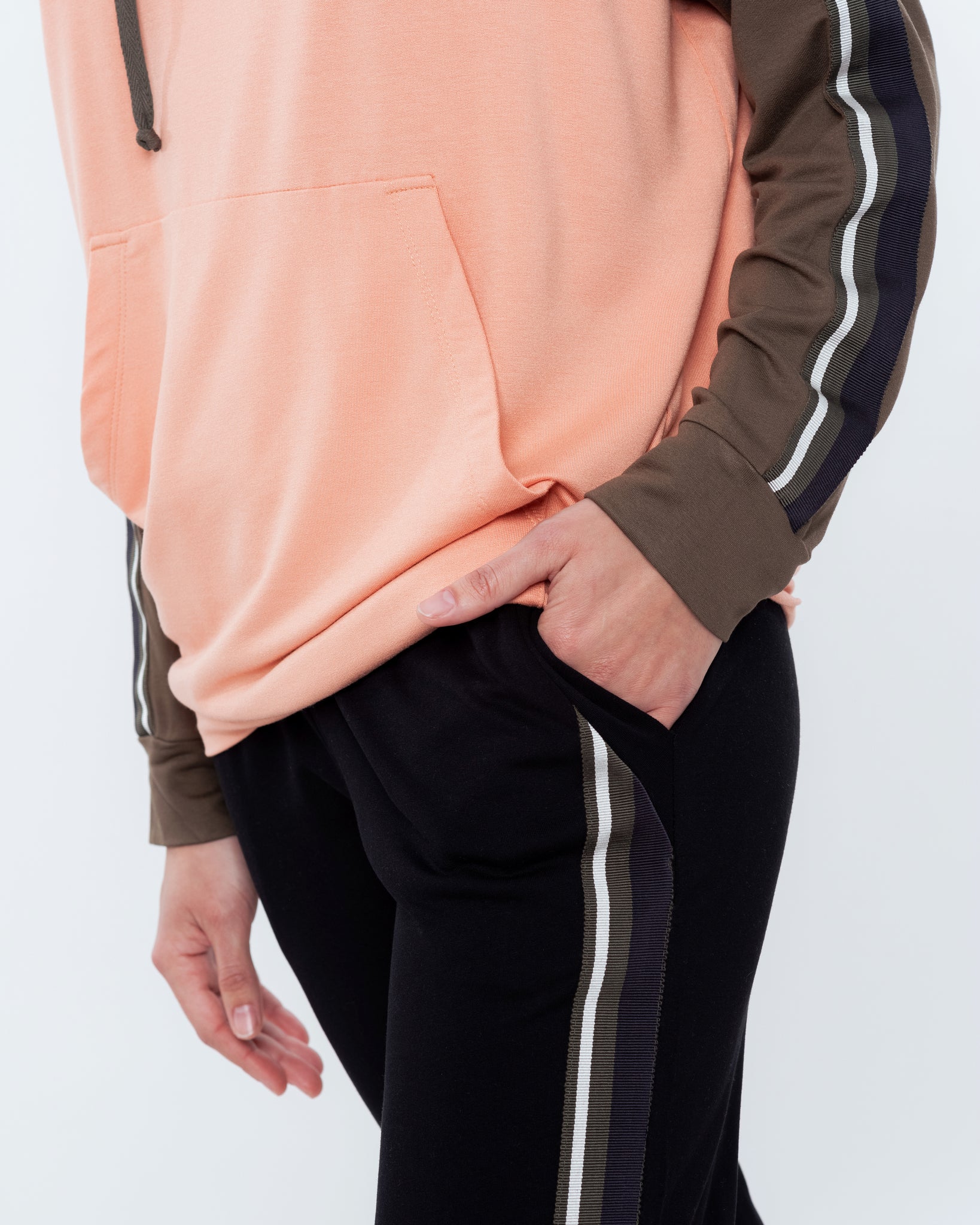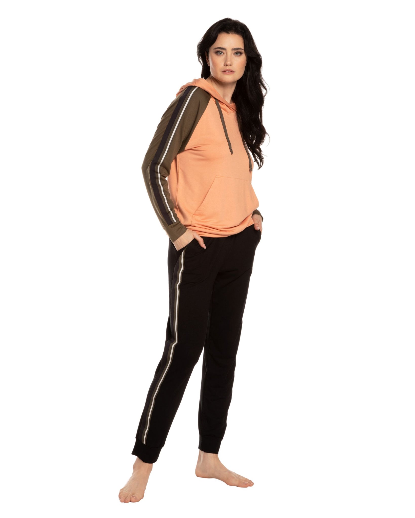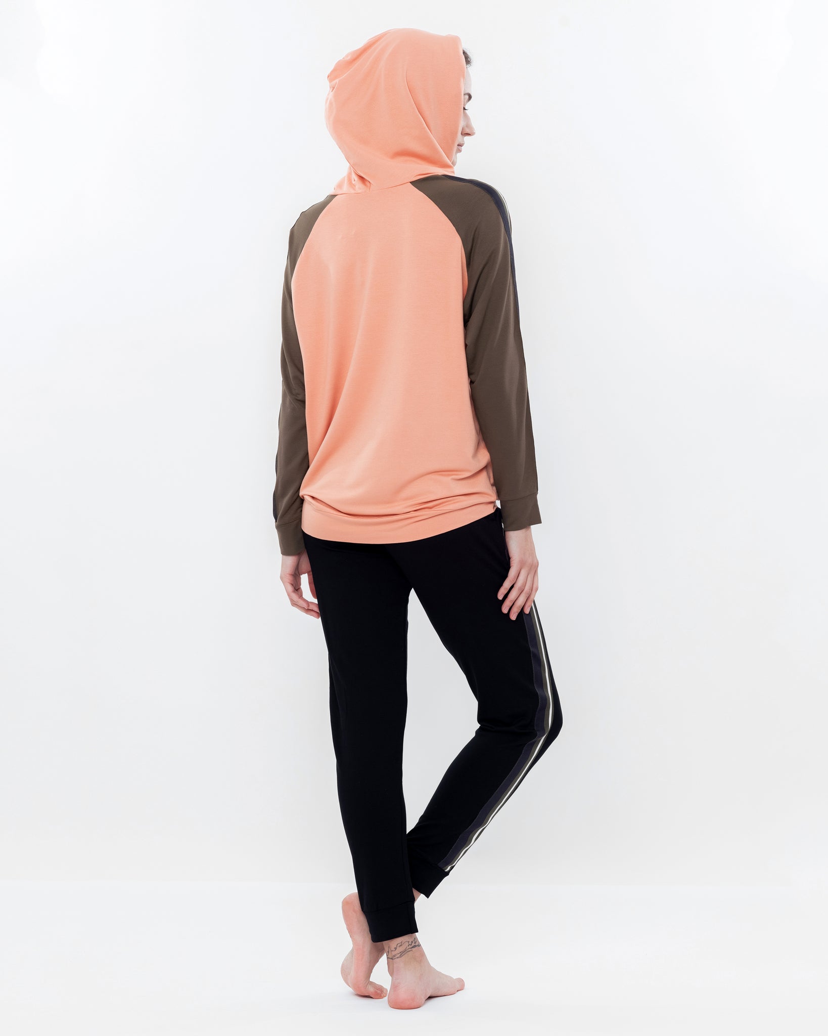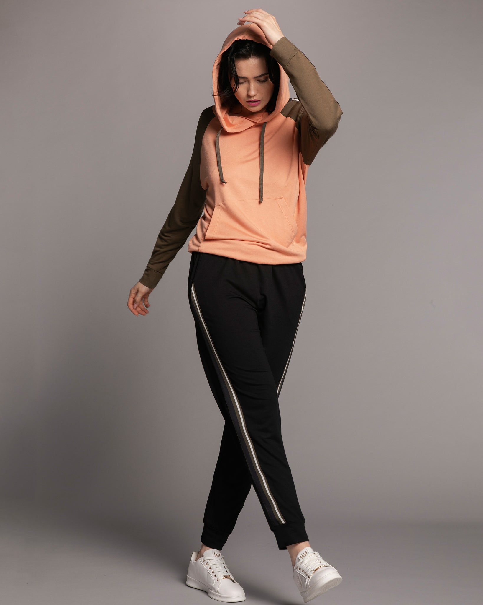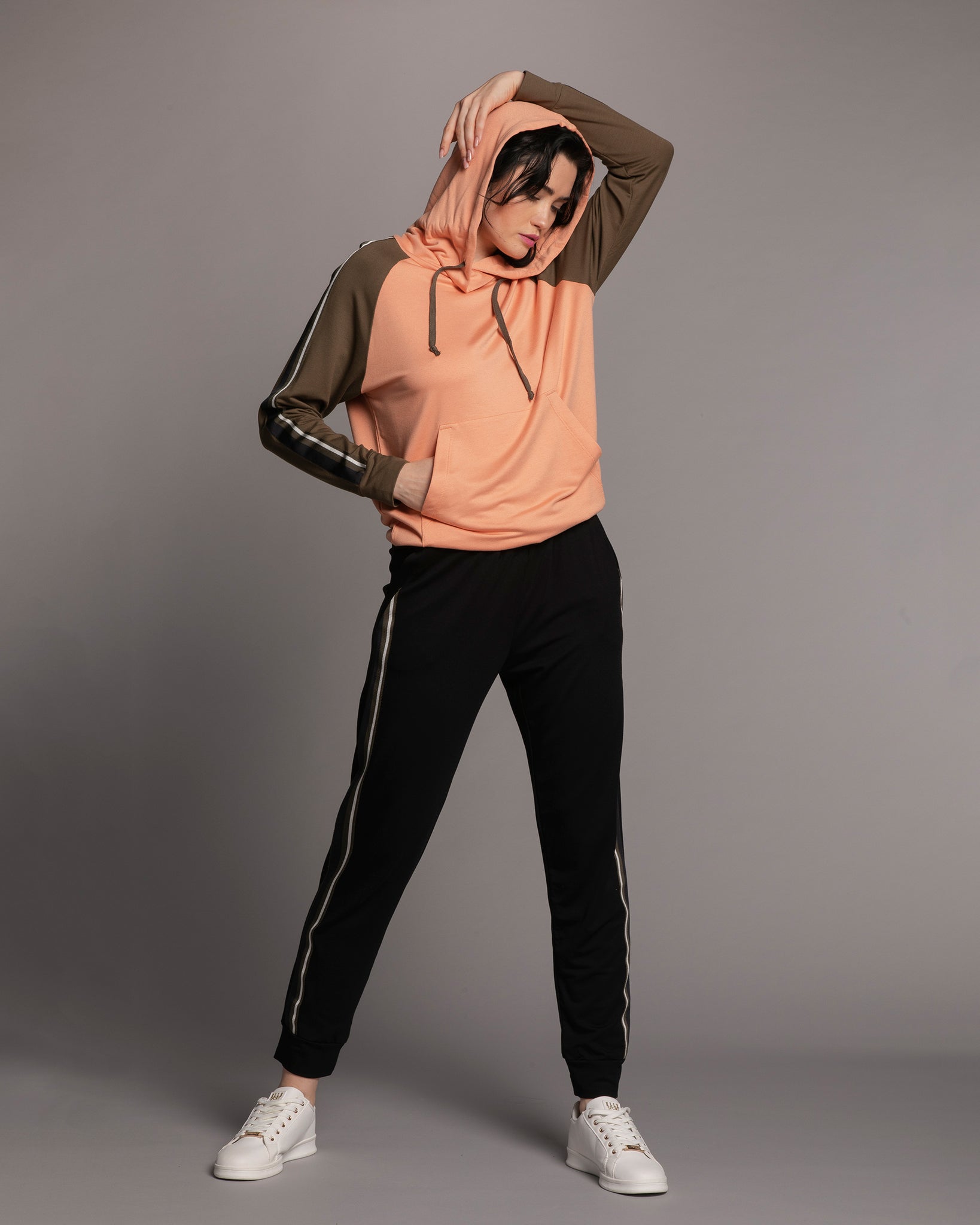 Silhouette — an athleisure-inspired set: a relaxed hoodie paired with tapered joggers, creating a dynamic and effortlessly stylish look for home.