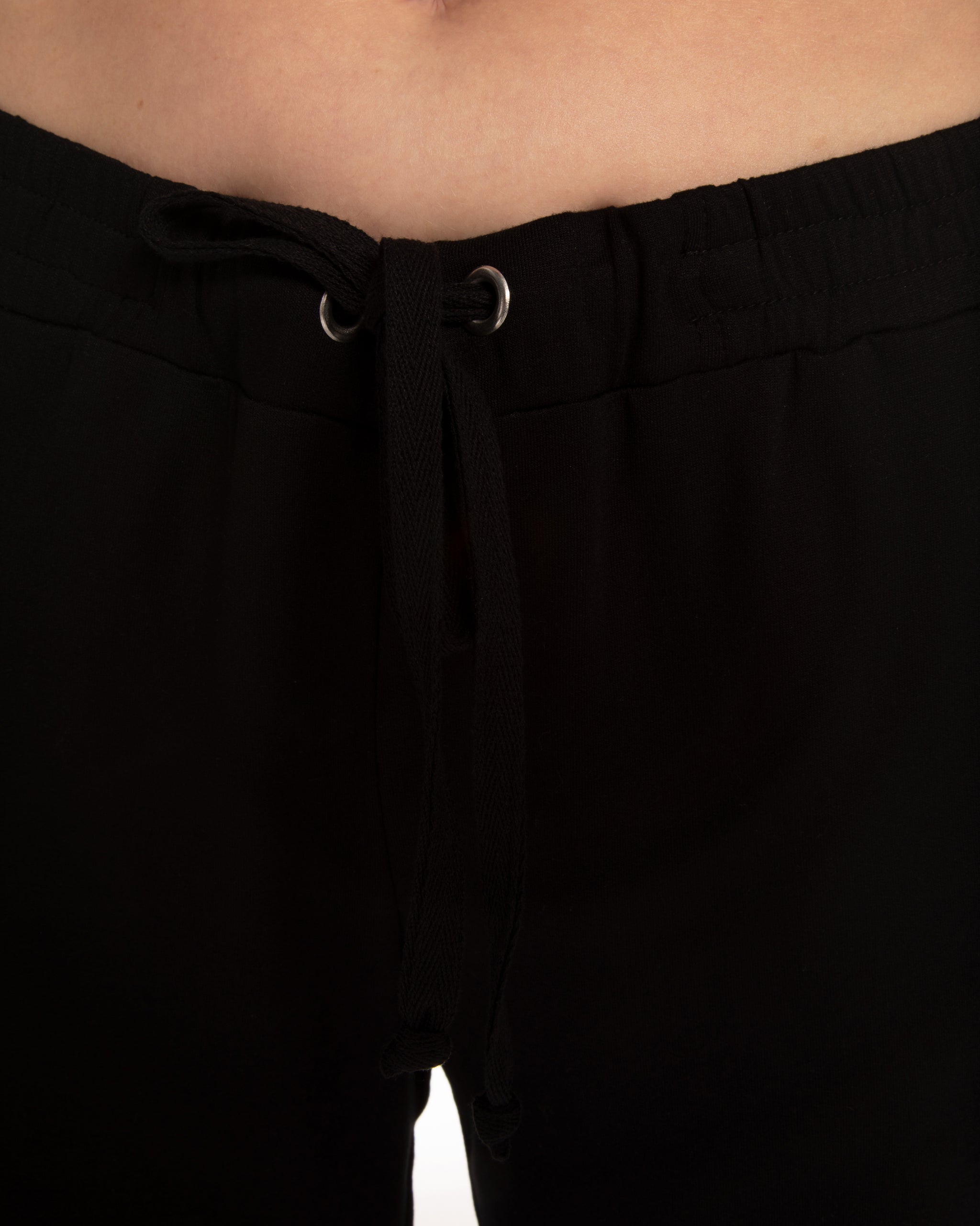 Bottom — tapered full-length joggers with an elasticated drawstring waistband featuring metal eyelets and side pockets; a contrasting stripe along the side seam echoes the sleeve detail and completes the sporty aesthetic.