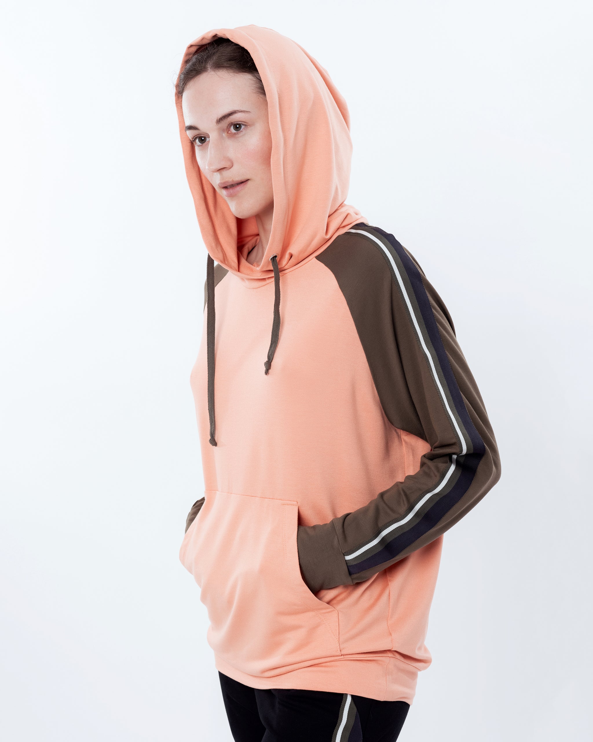 Hoodie — a relaxed fit with a drawstring hood and a kangaroo pocket; the raglan sleeves are crafted in a contrasting khaki colour with a decorative stripe running along the sleeve, adding a sporty character and visual interest to the look.