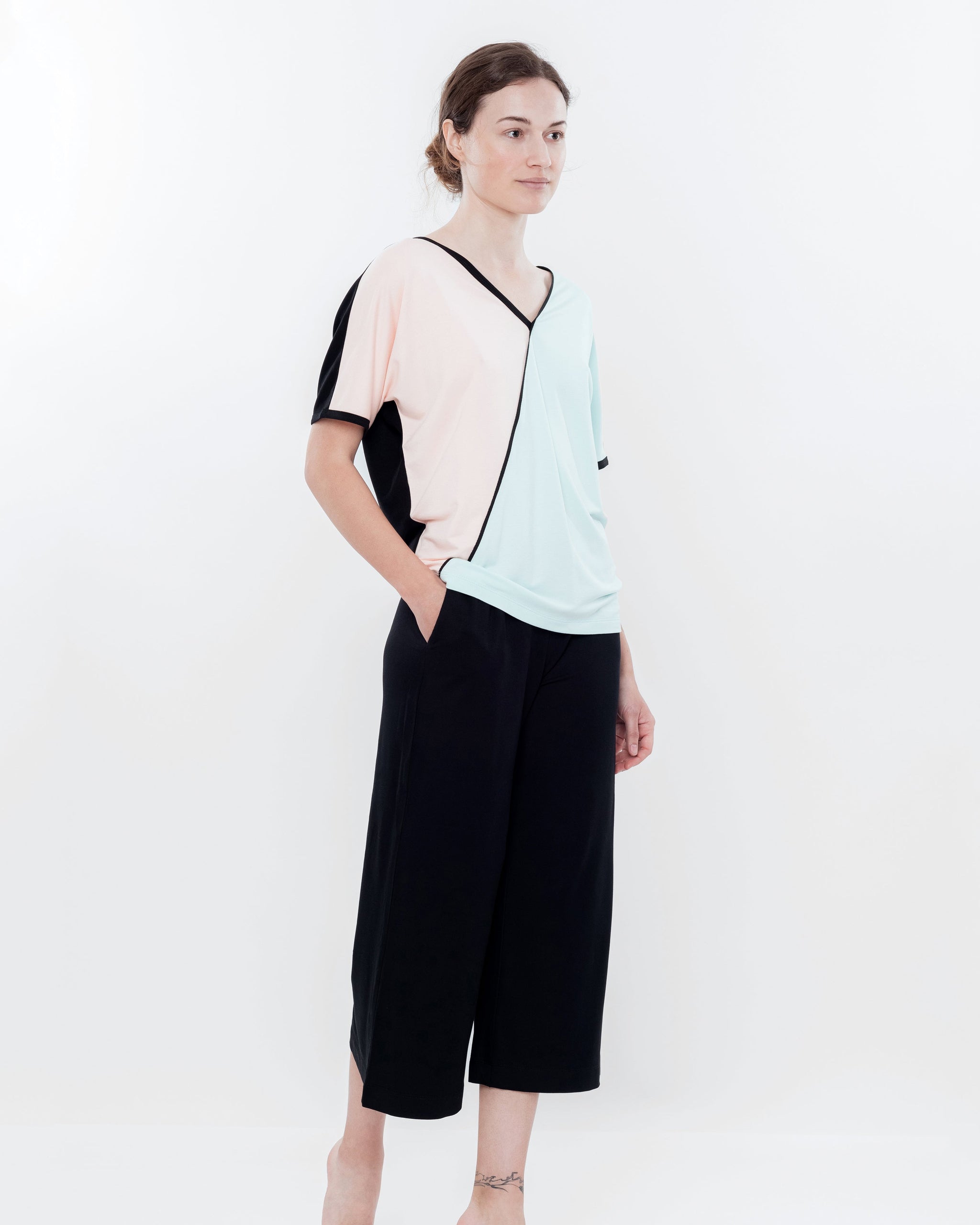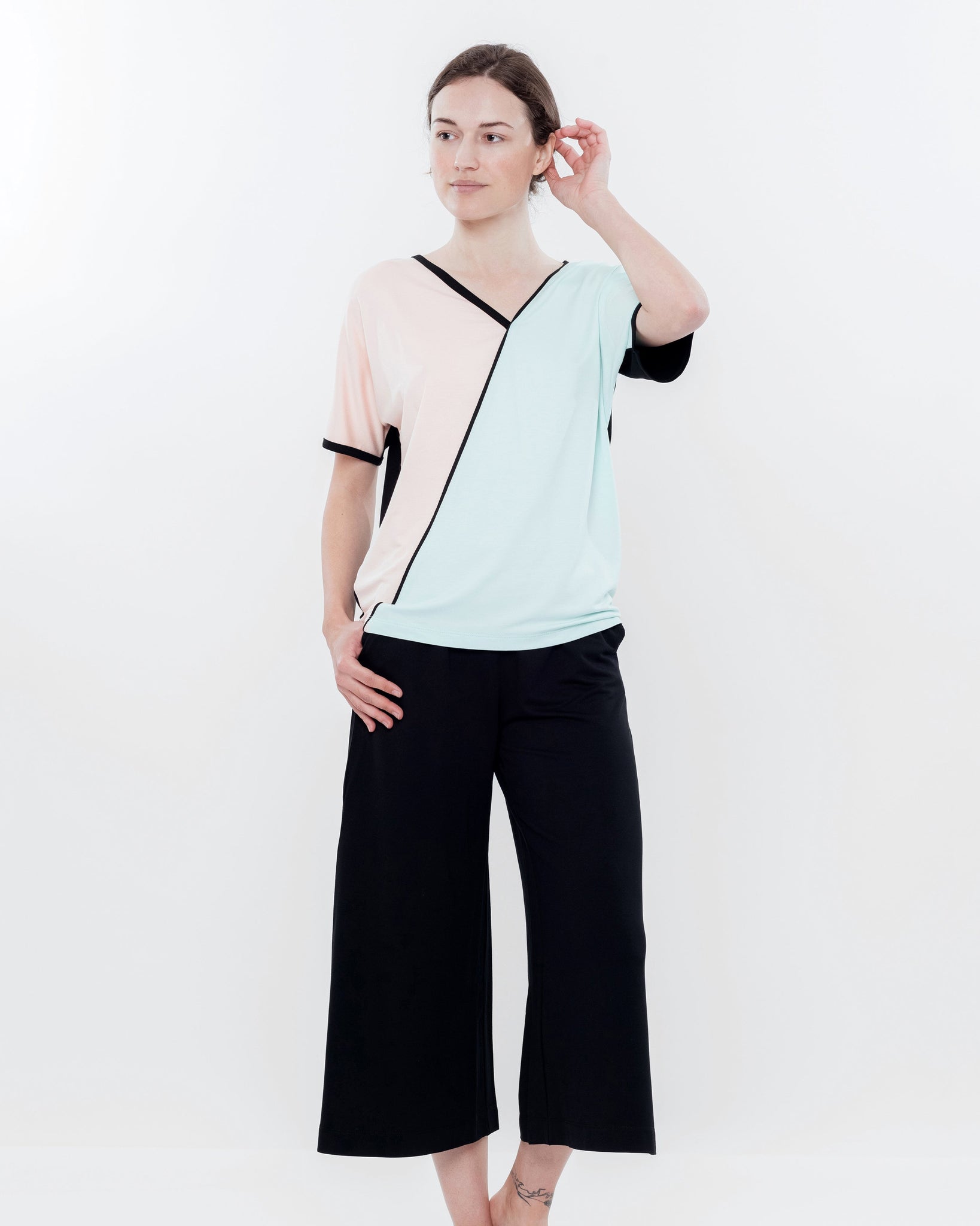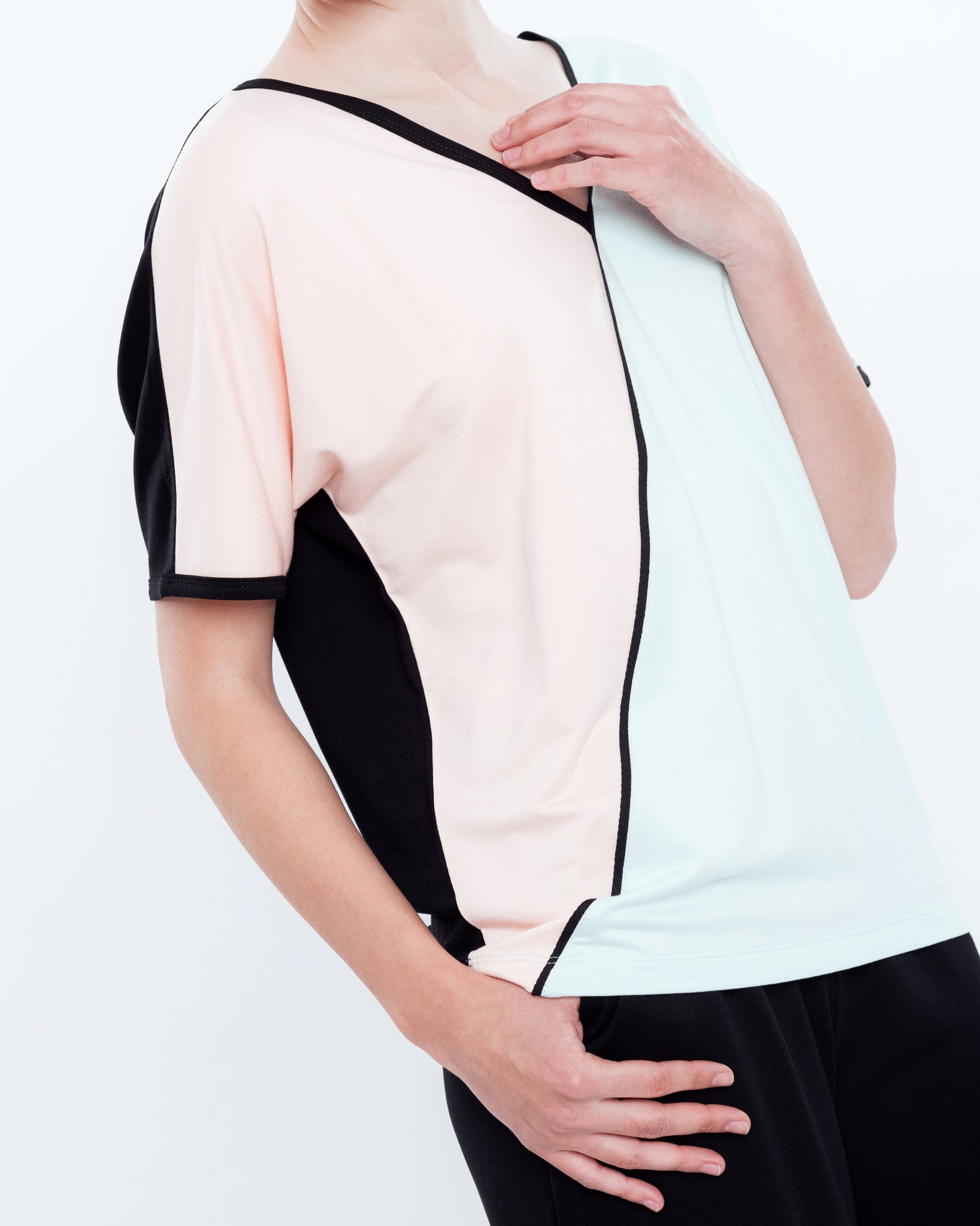 Neckline — a V-shaped neckline with a clean black trim frames a bold colour-block composition: a peach panel and a mint panel divided by a diagonal seam with black piping — a striking geometric detail that defines the top.