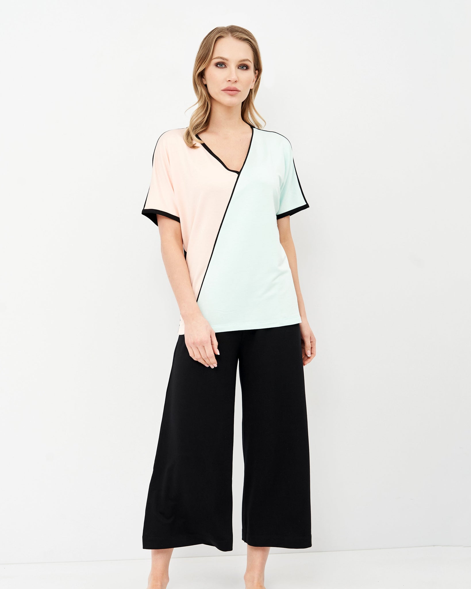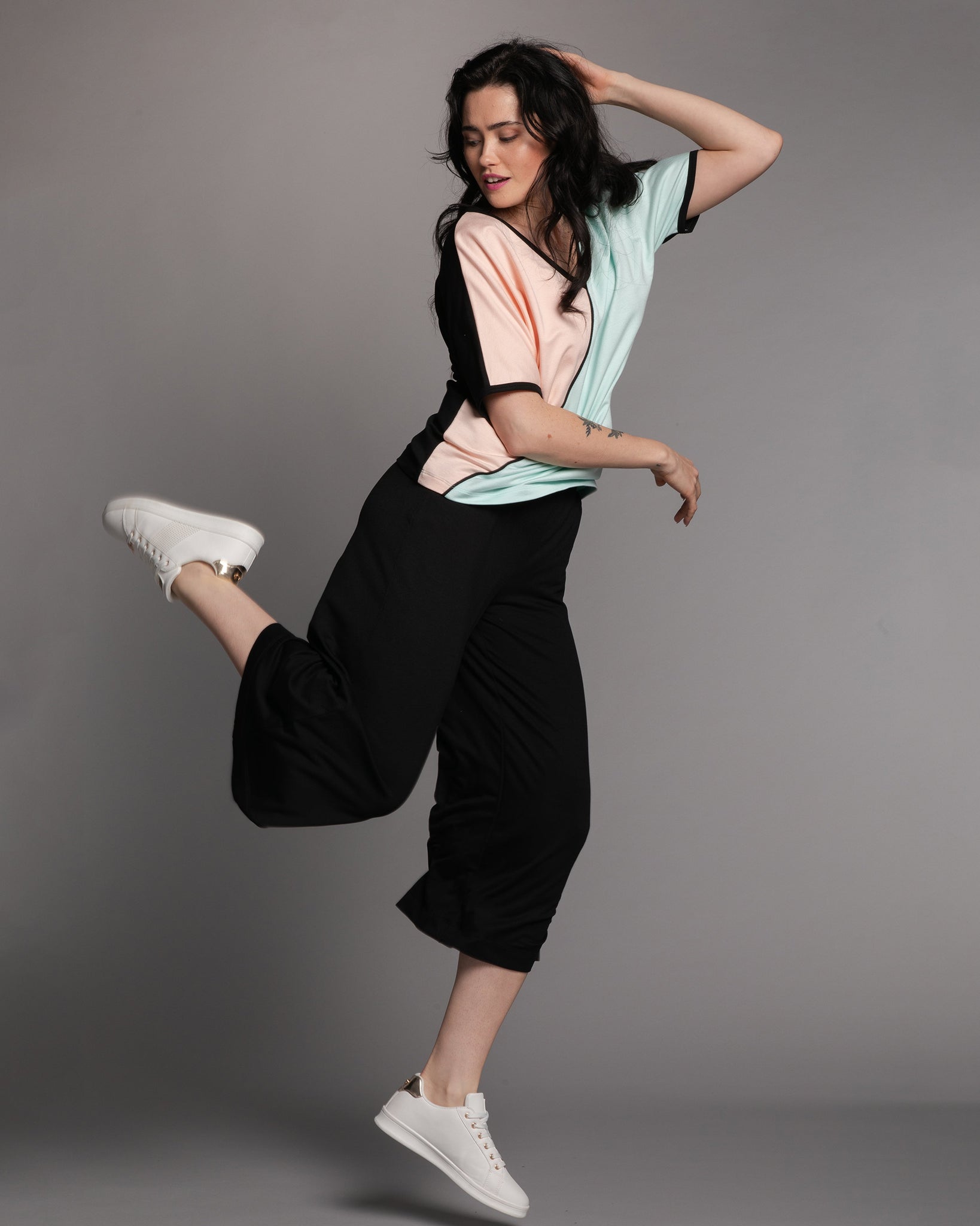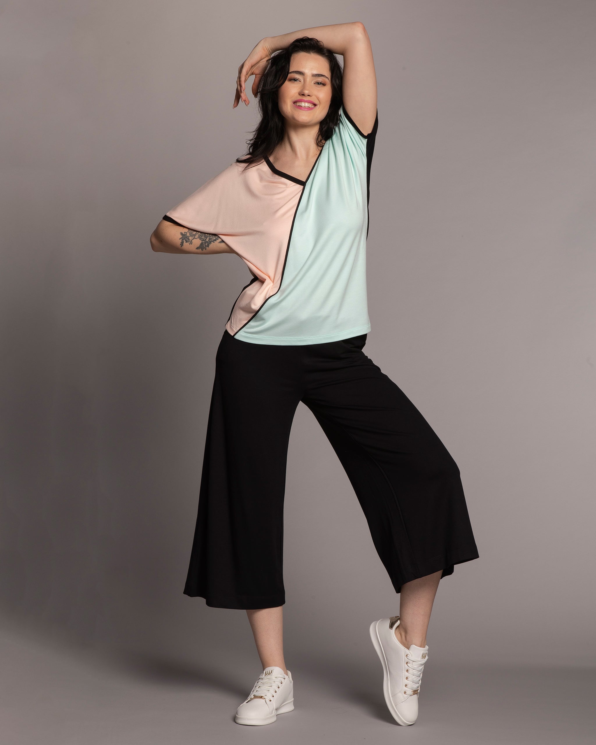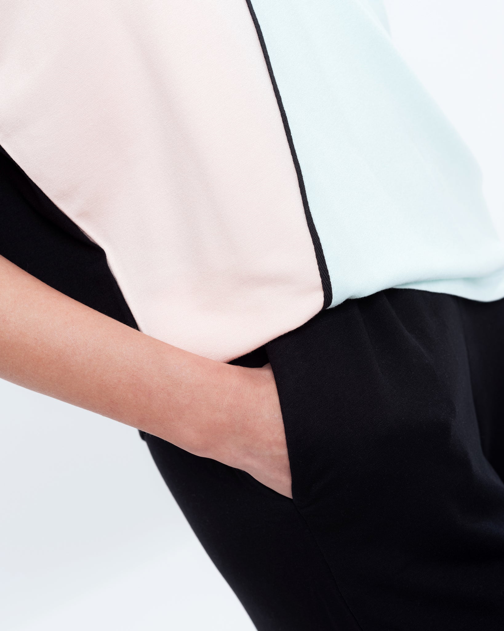 Neckline — a V-shaped neckline with a clean black trim frames a bold colour-block composition: a peach panel and a mint panel divided by a diagonal seam with black piping — a striking geometric detail that defines the top.