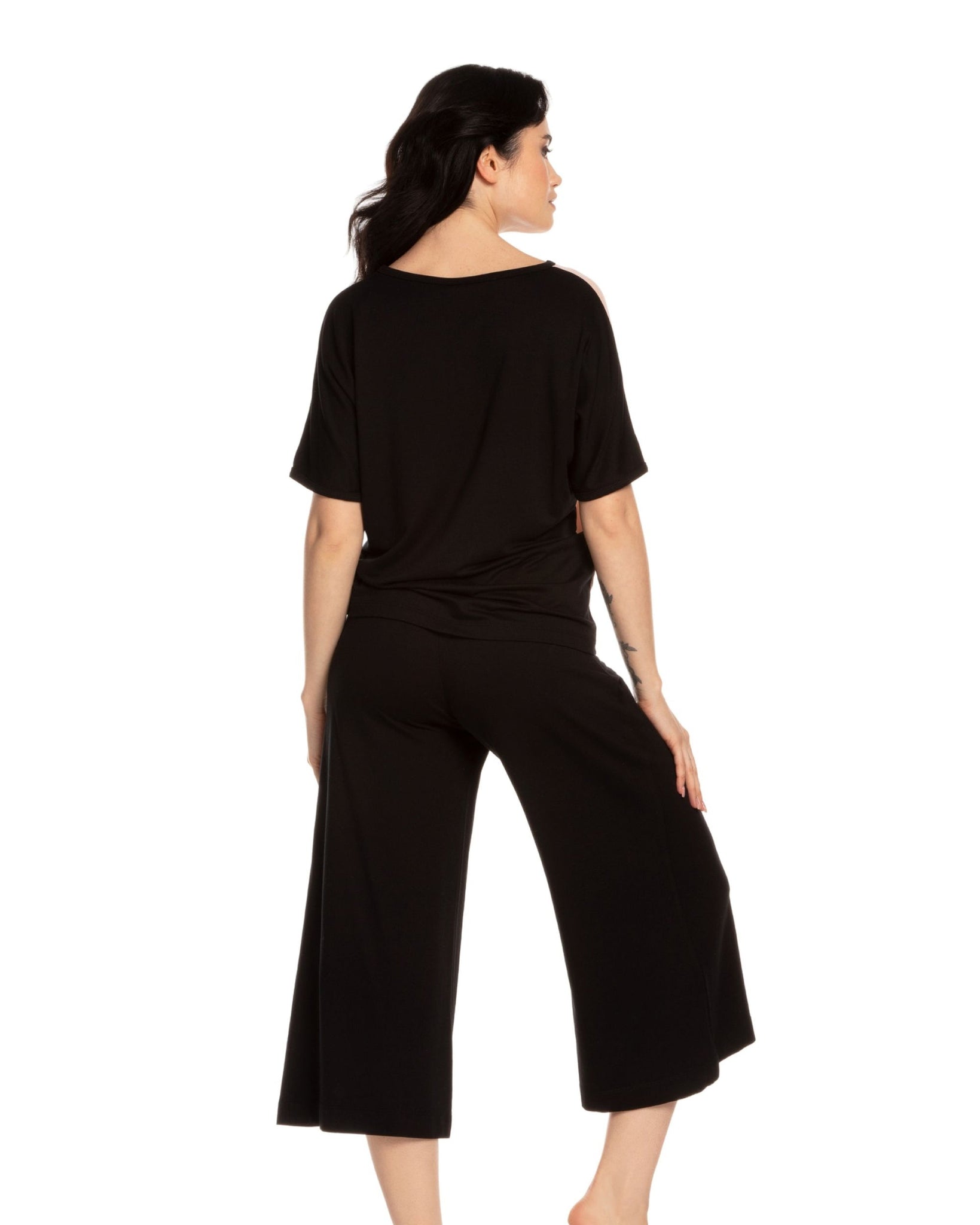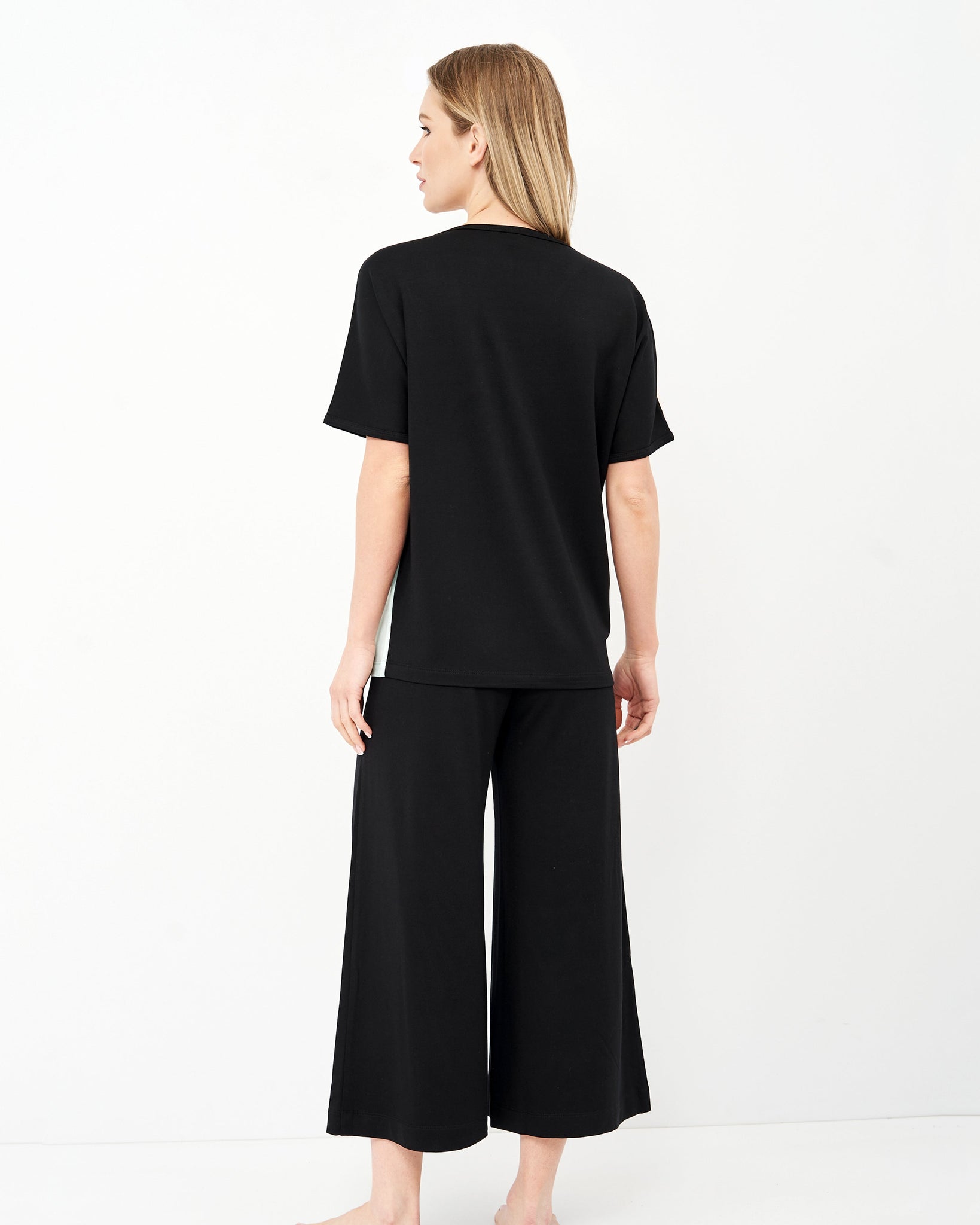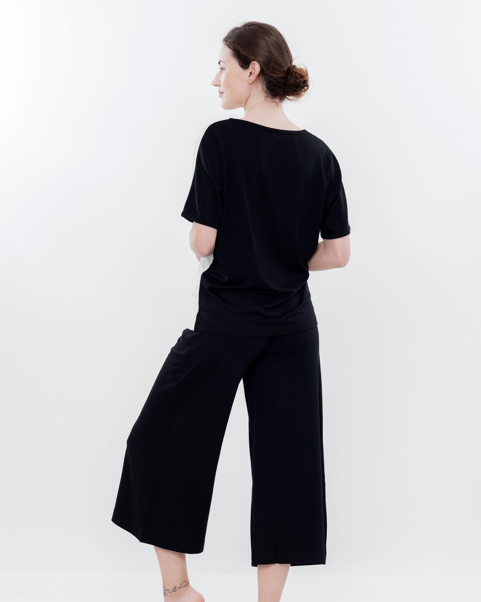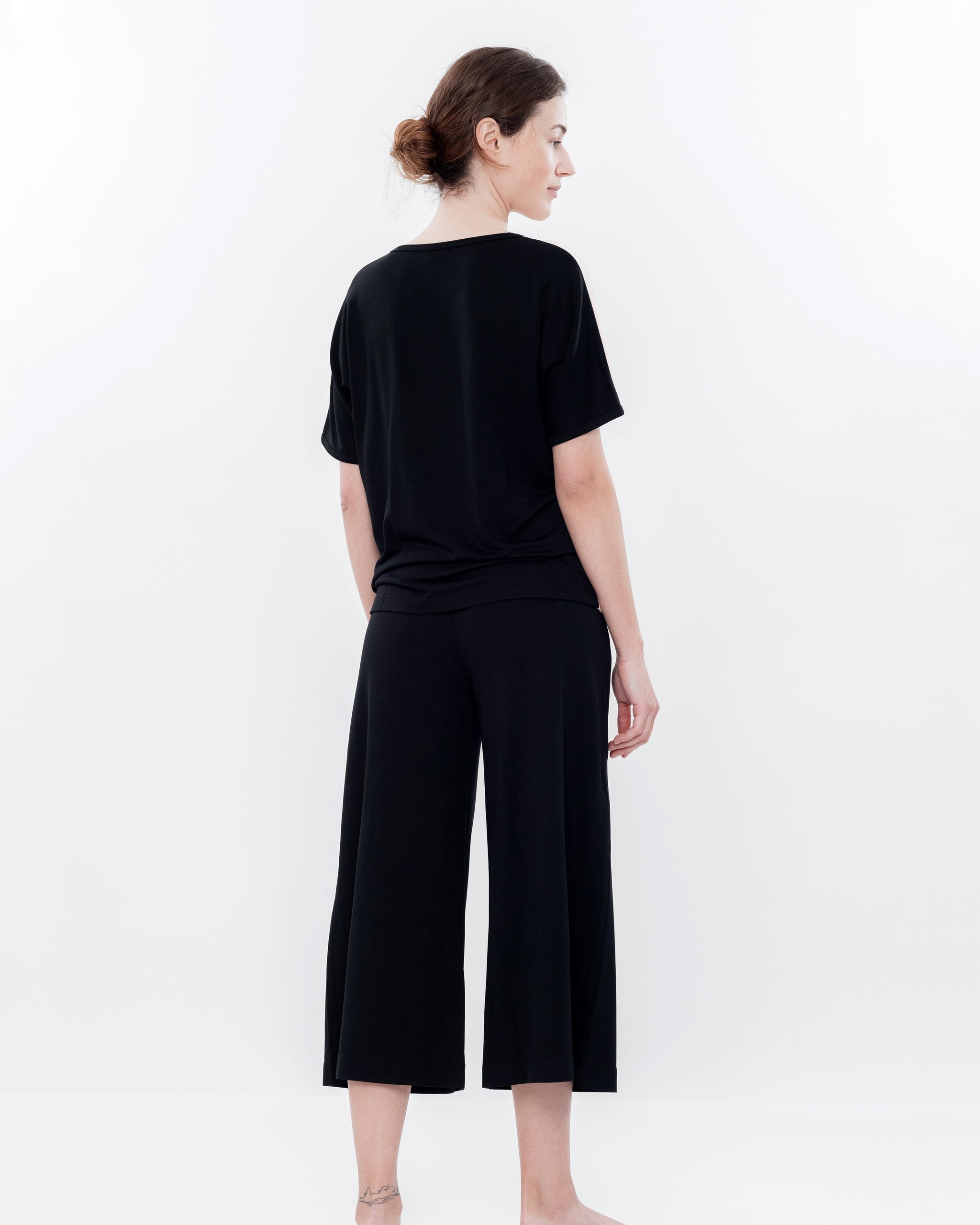 Silhouette — a stylish home set: a relaxed short-sleeve top paired with wide-leg 7/8 length trousers, creating a comfortable and refined casual luxe look.