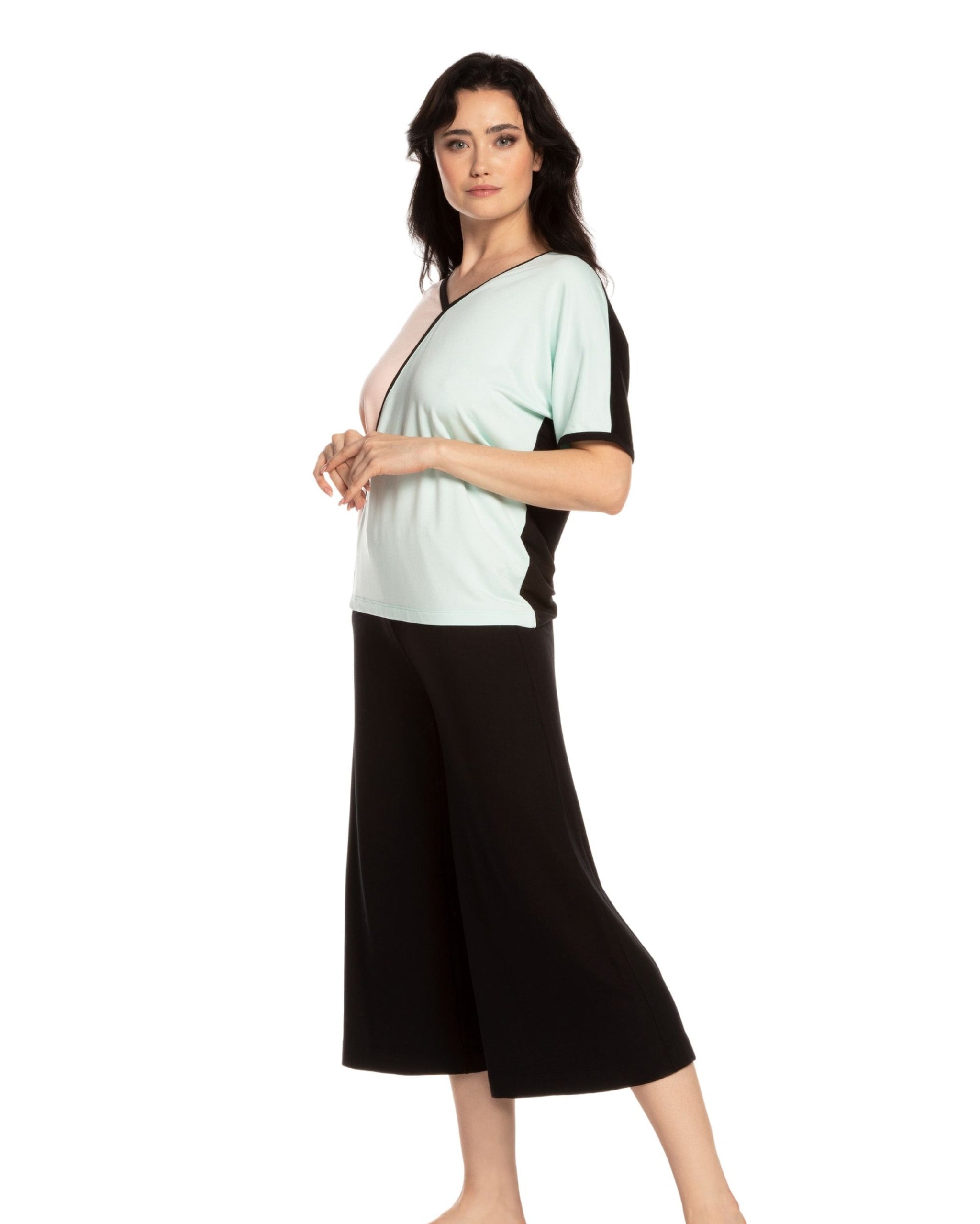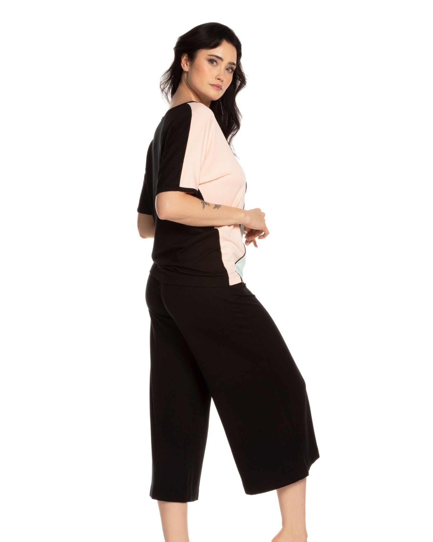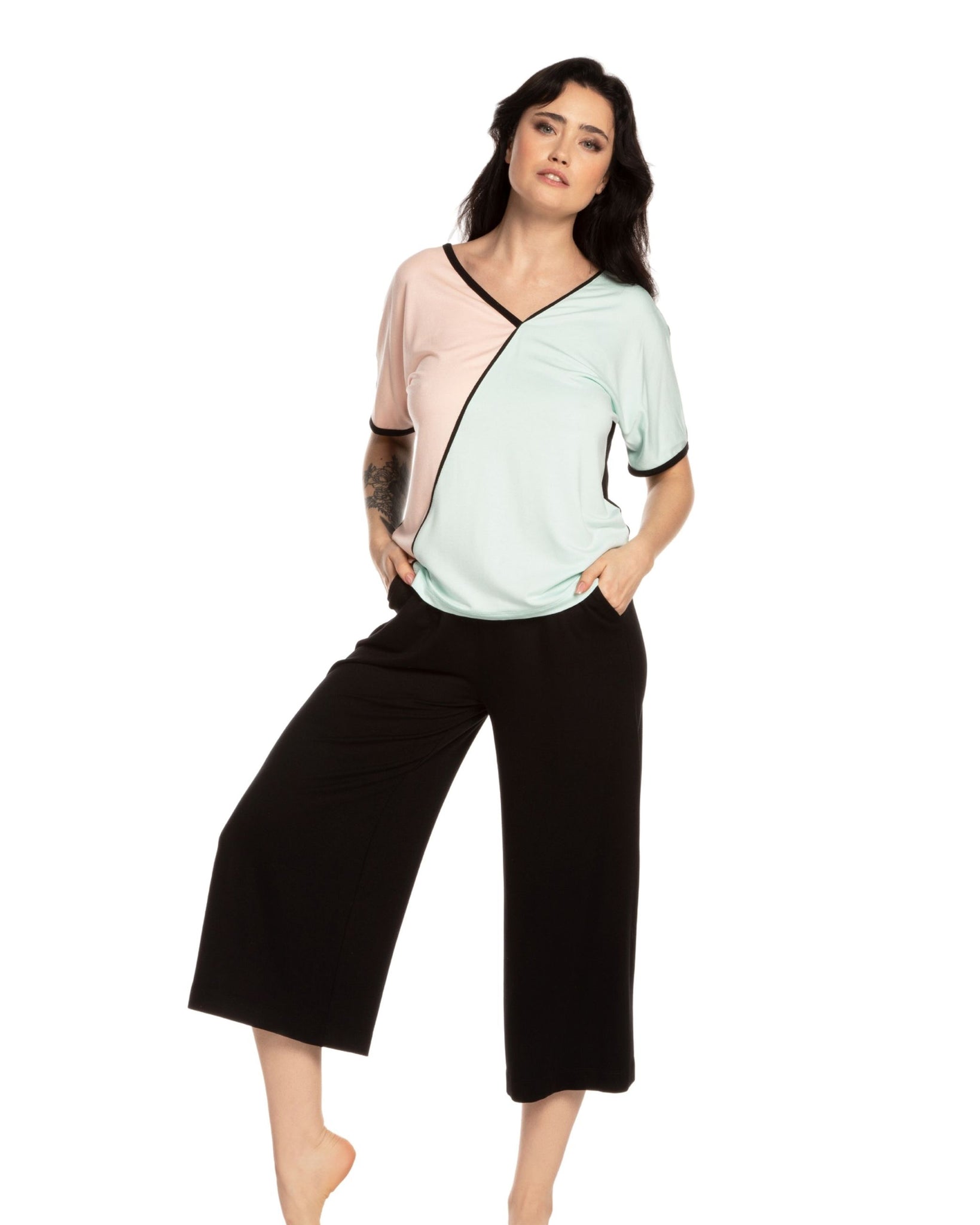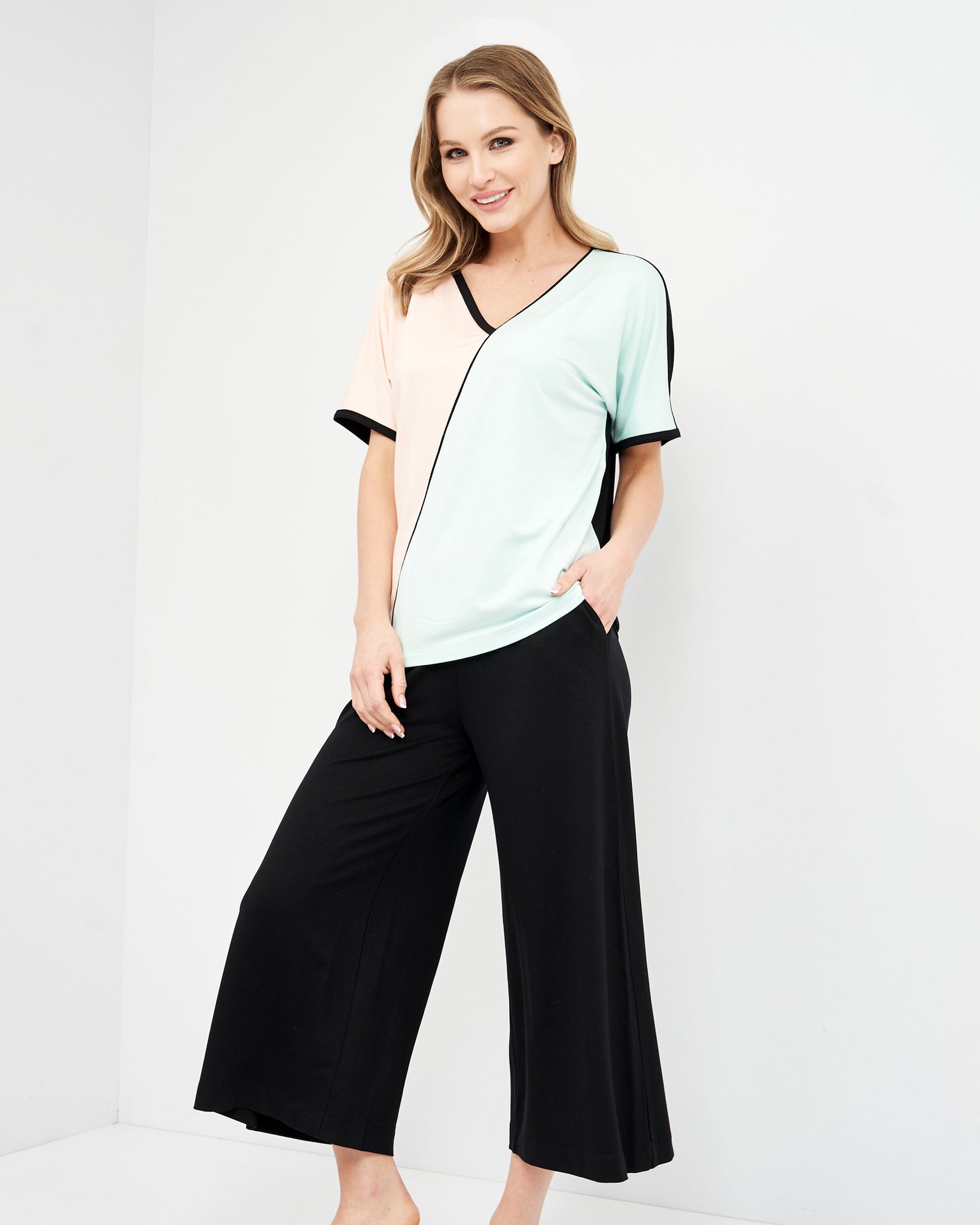 Silhouette — a stylish home set: a relaxed short-sleeve top paired with wide-leg 7/8 length trousers, creating a comfortable and refined casual luxe look.
