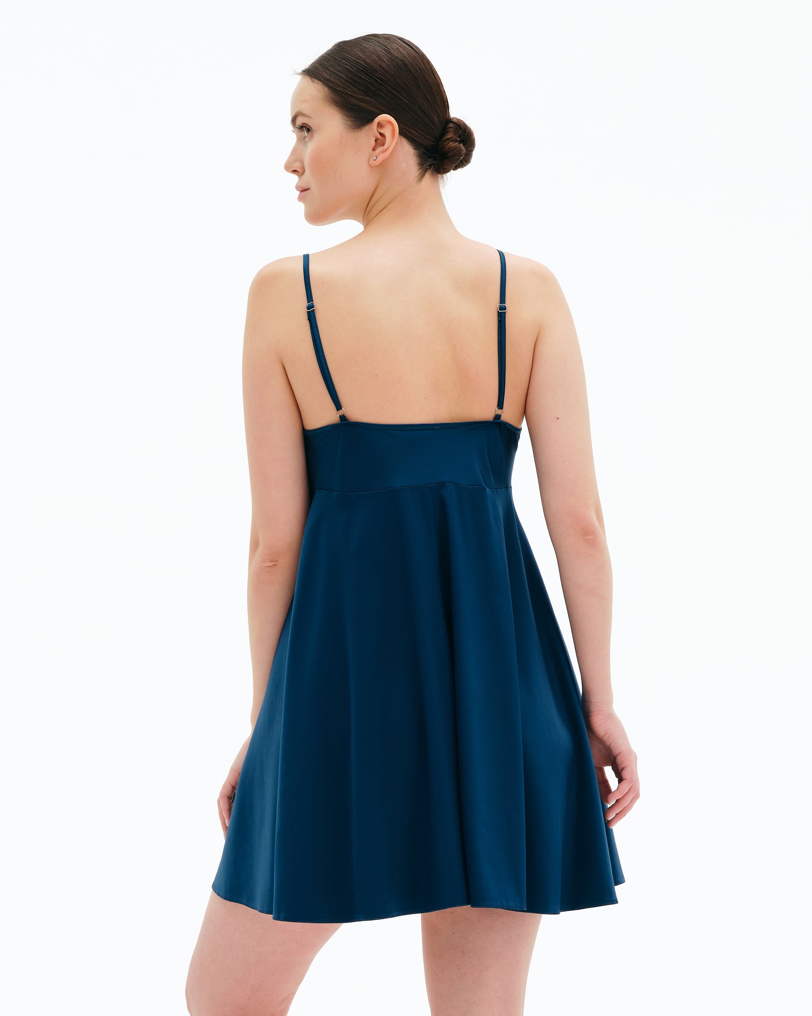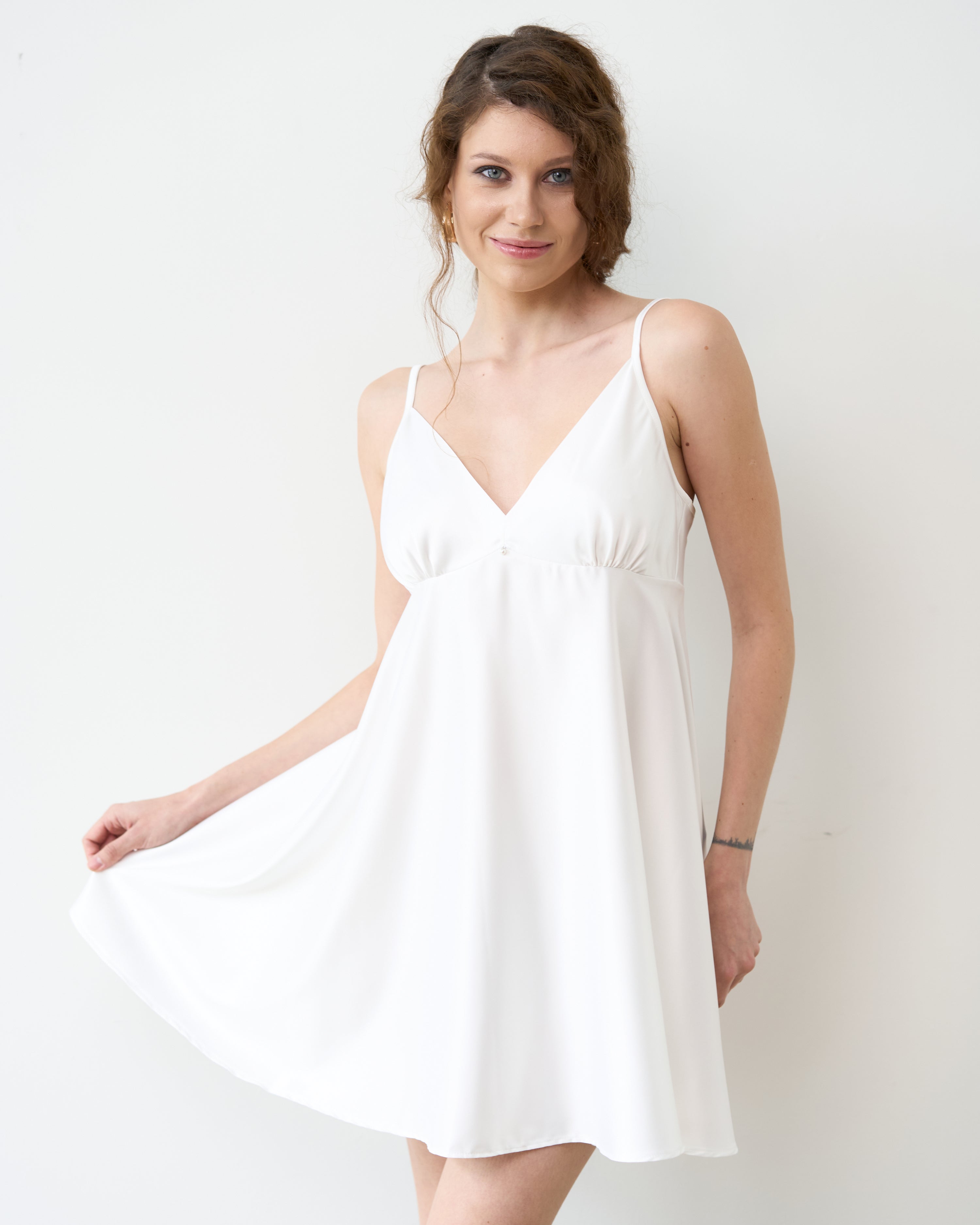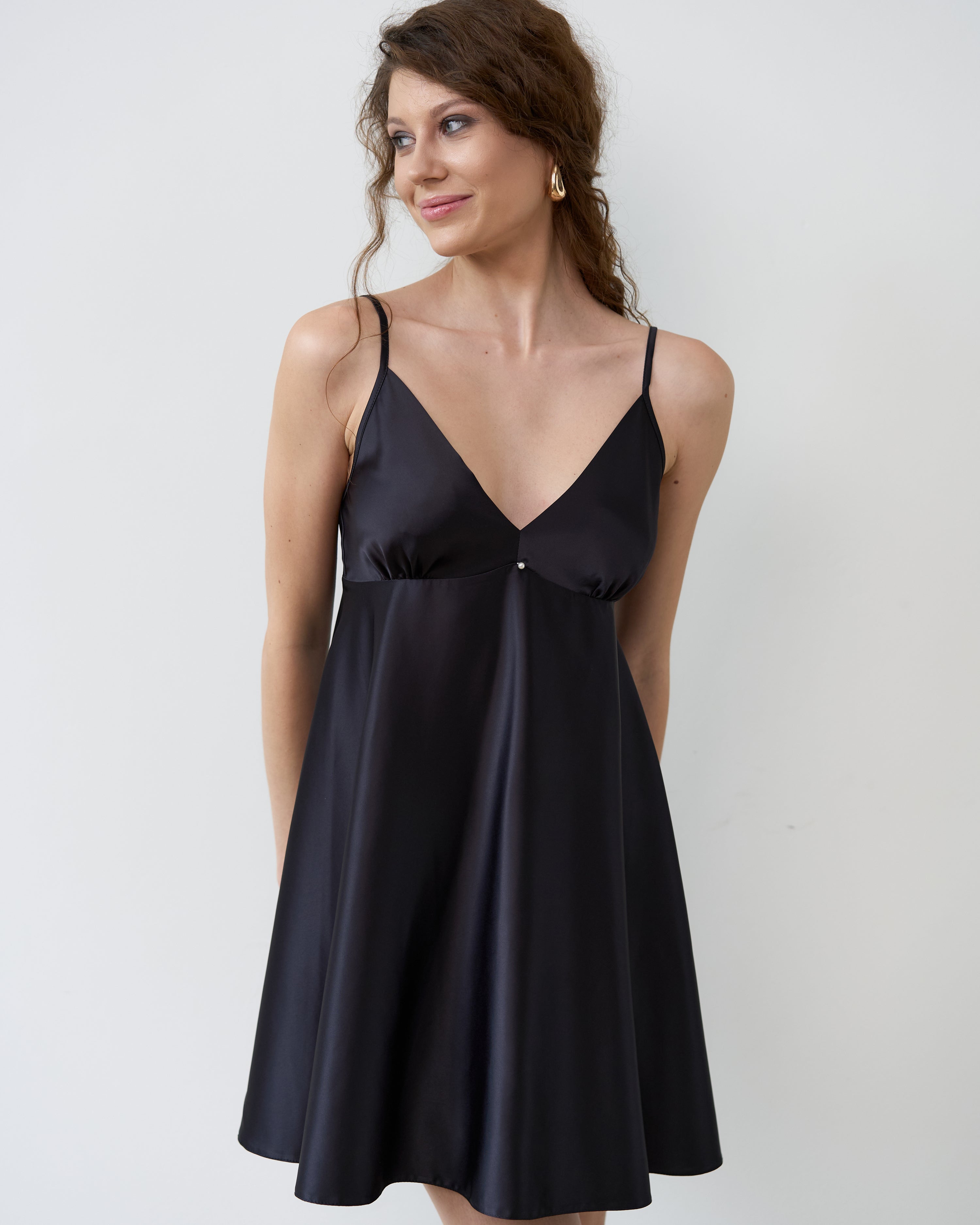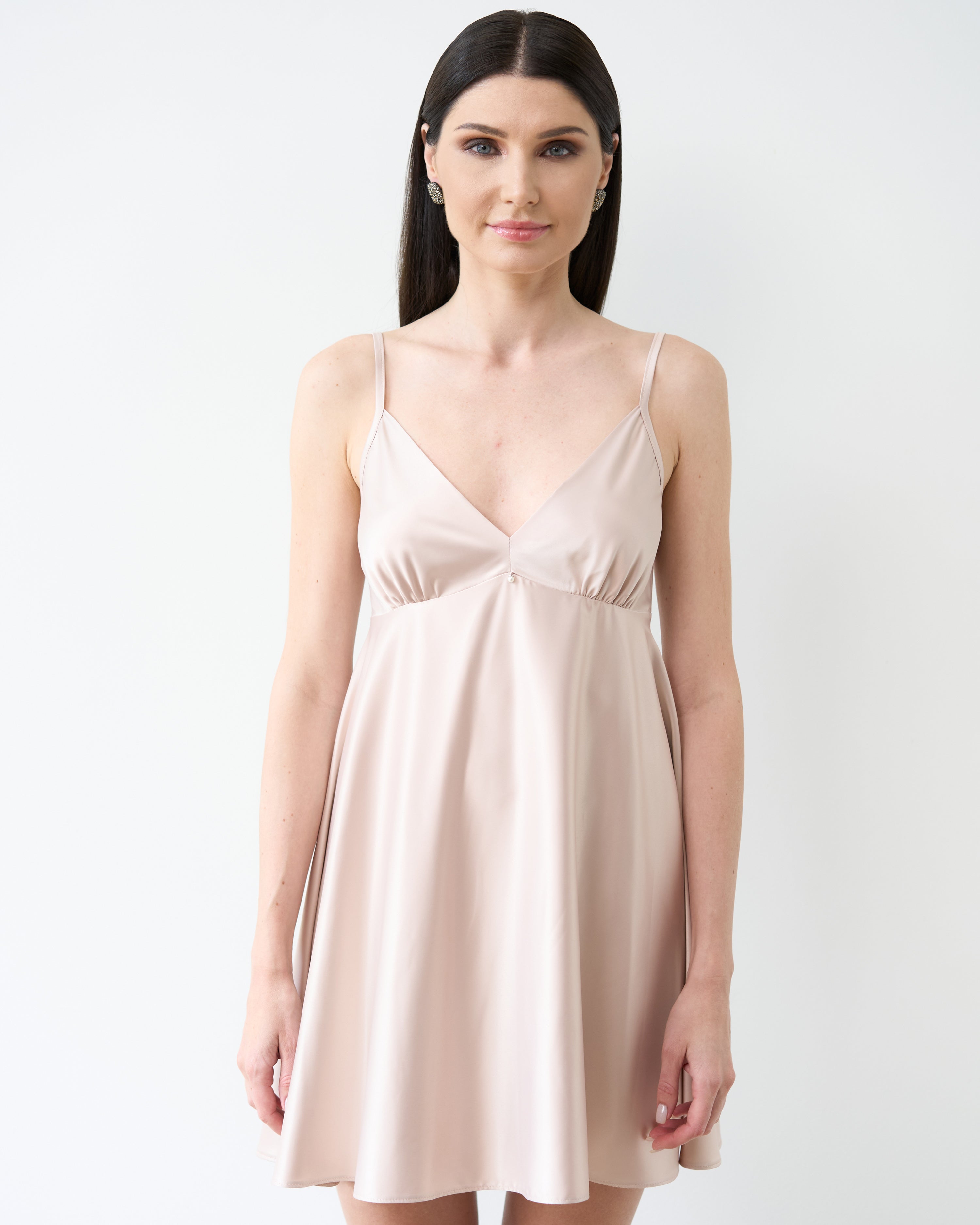 Silhouette — semi-fitted with a soft A-line flare toward the hem, gently accentuating the bust line and creating a light, refined silhouette.