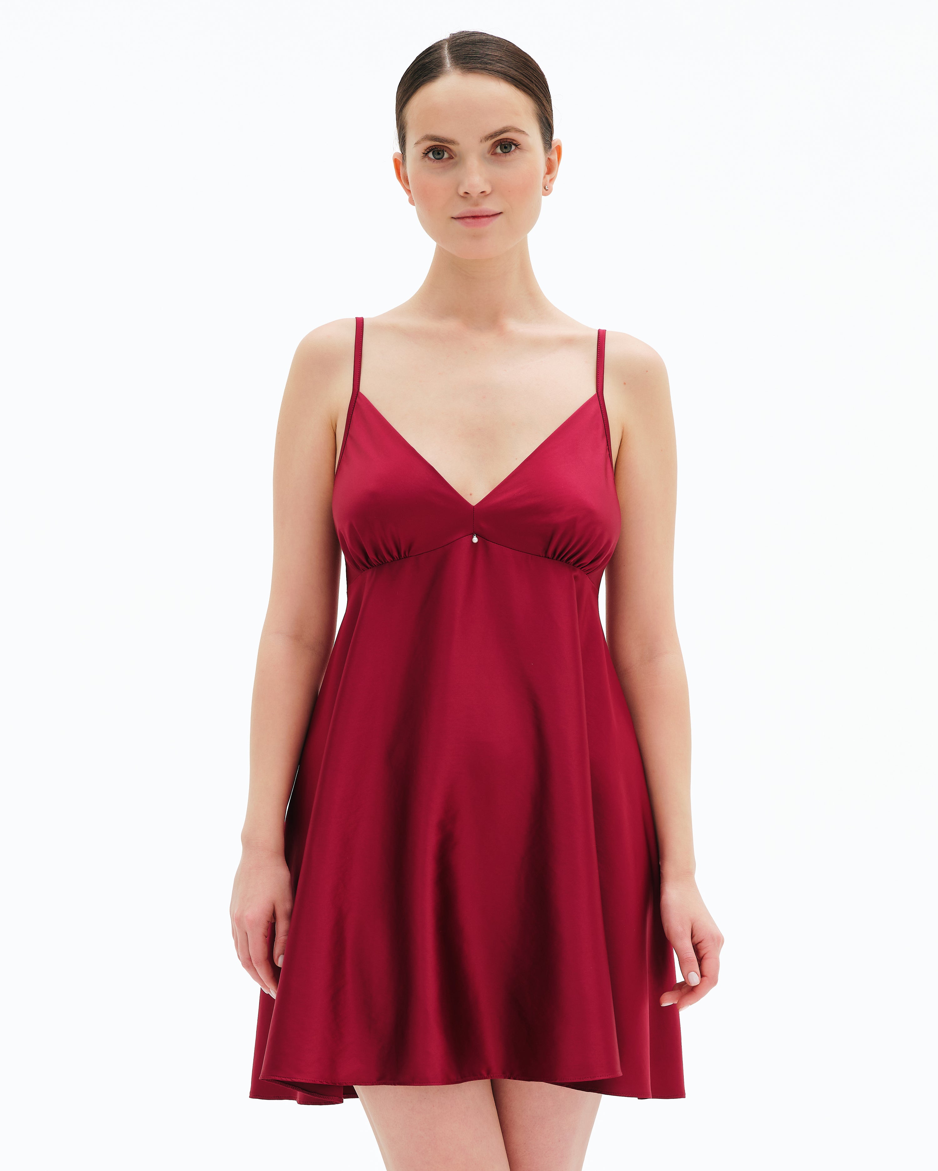 Neckline — a V-shaped neckline with softly shaped cups, delicately accented with a small pearl at the center, creating an elegant focal point.