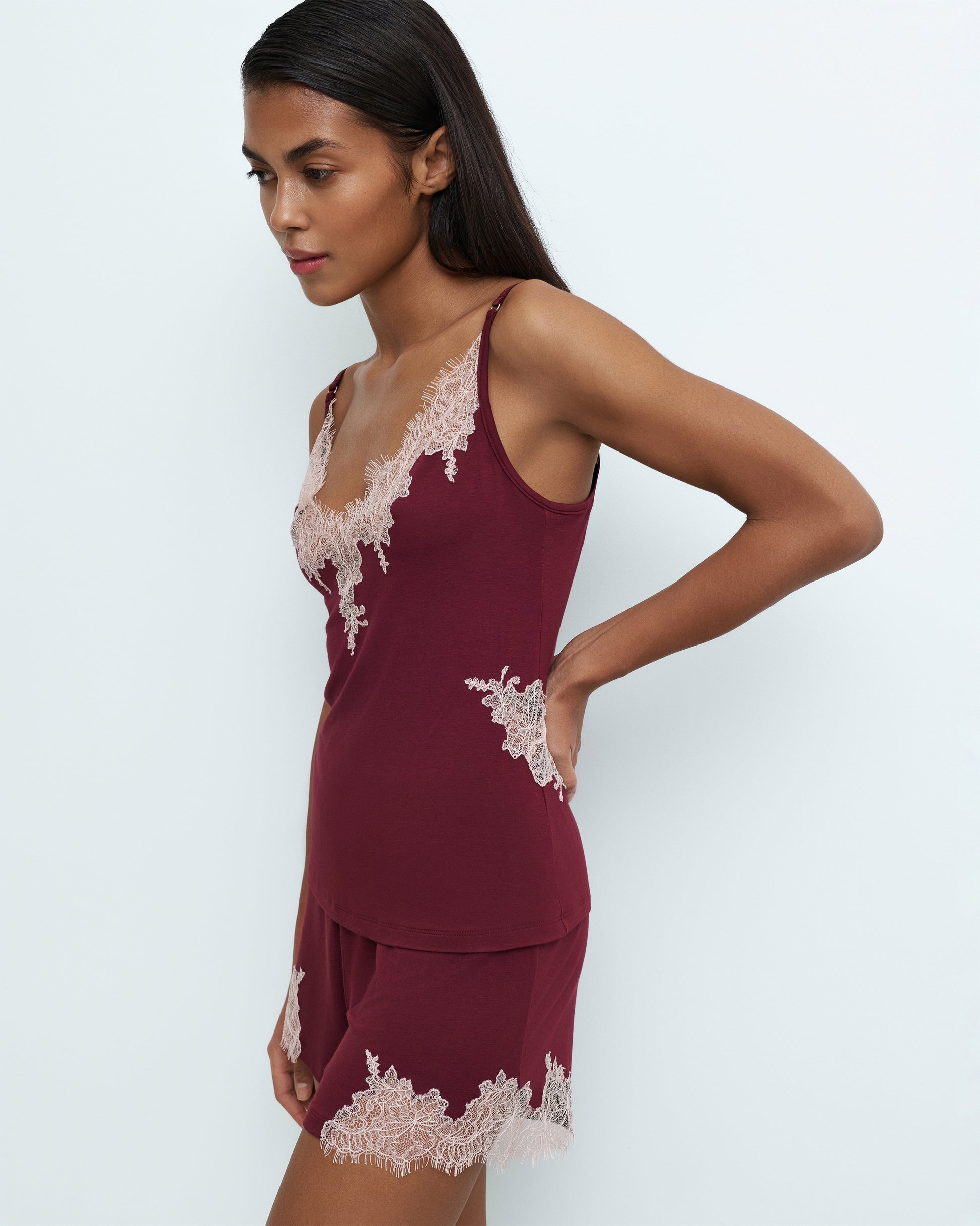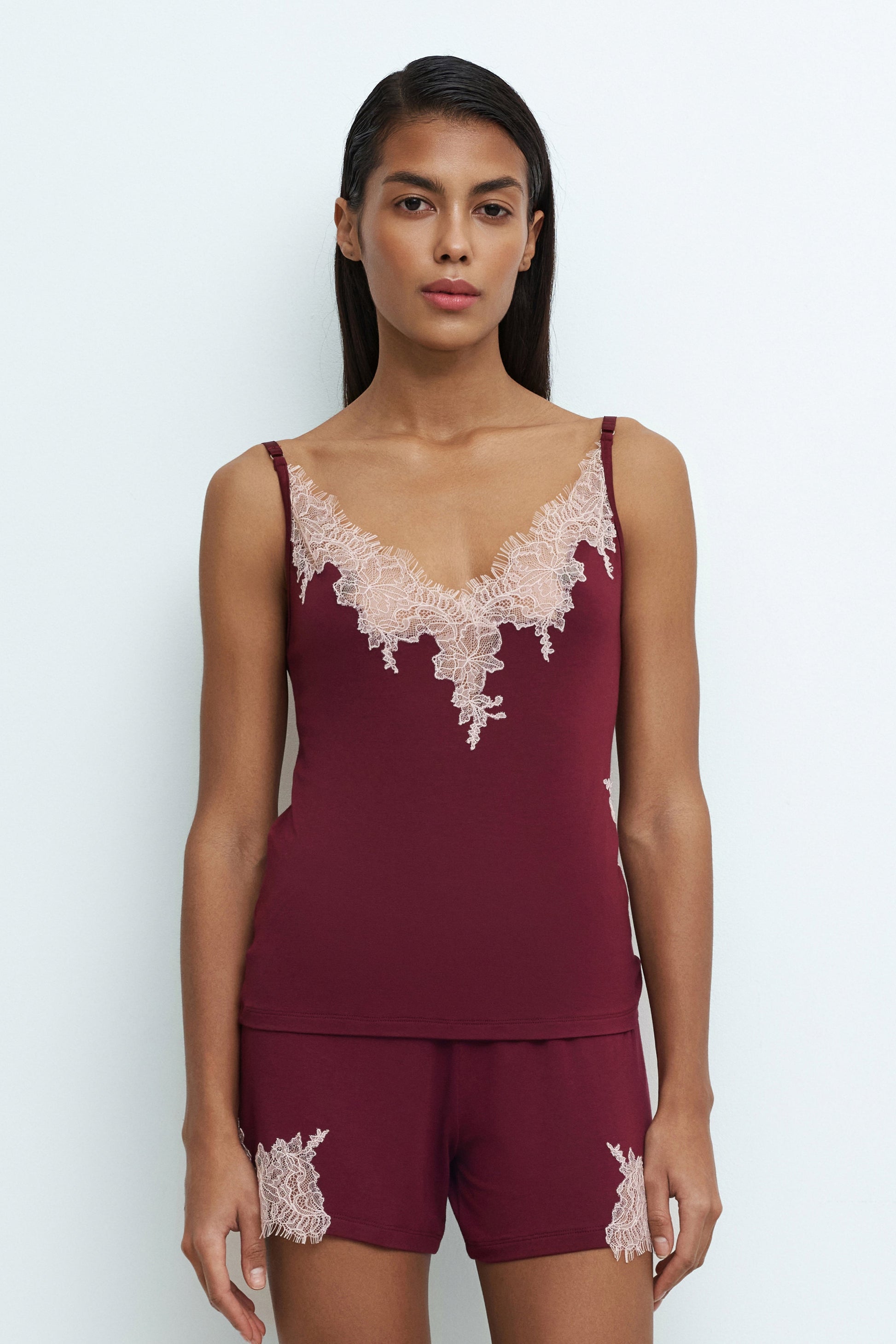 This delicate arrangement of short black bottoms and sleeveless top, with exquisite lace accents and chest piece, has a supreme air of elegant sensuality. All lace is cut by hand.