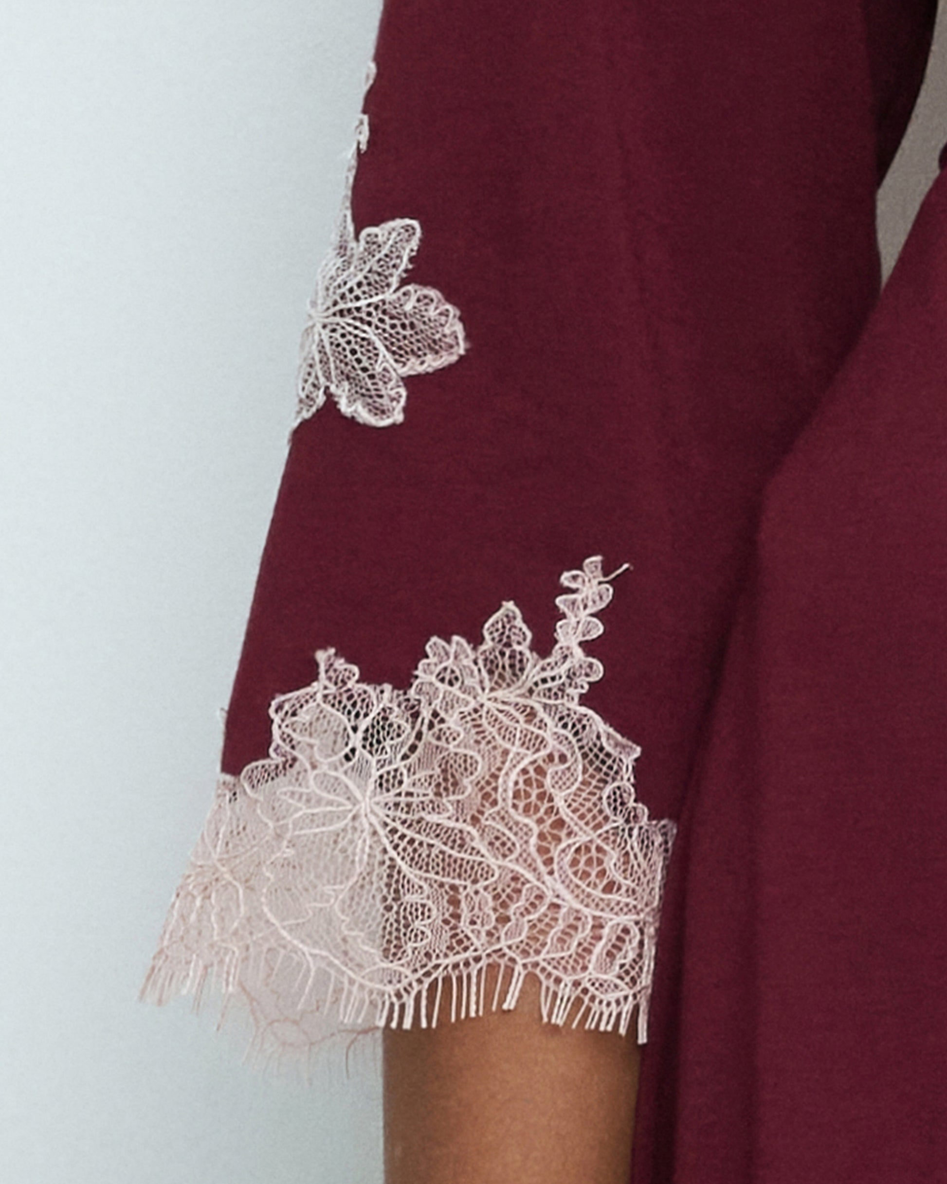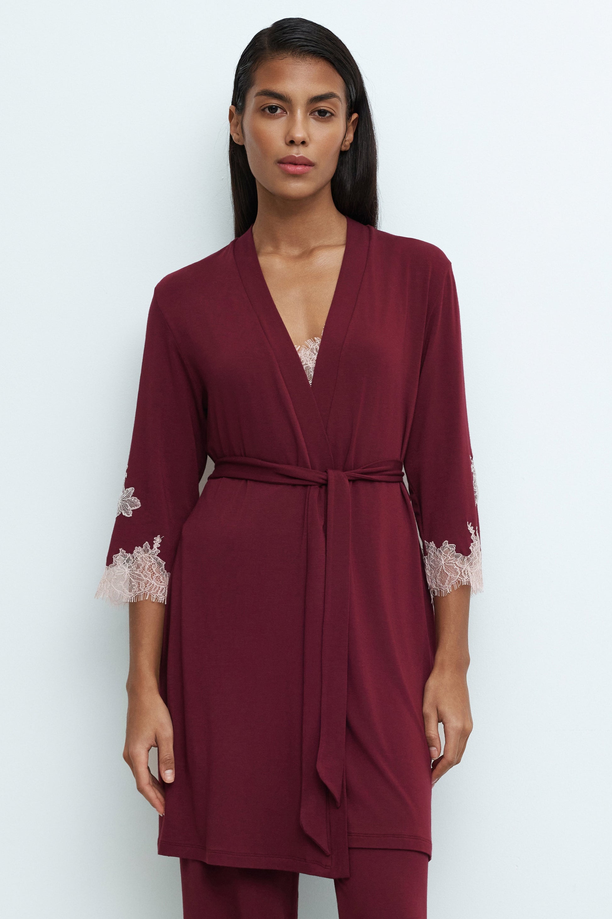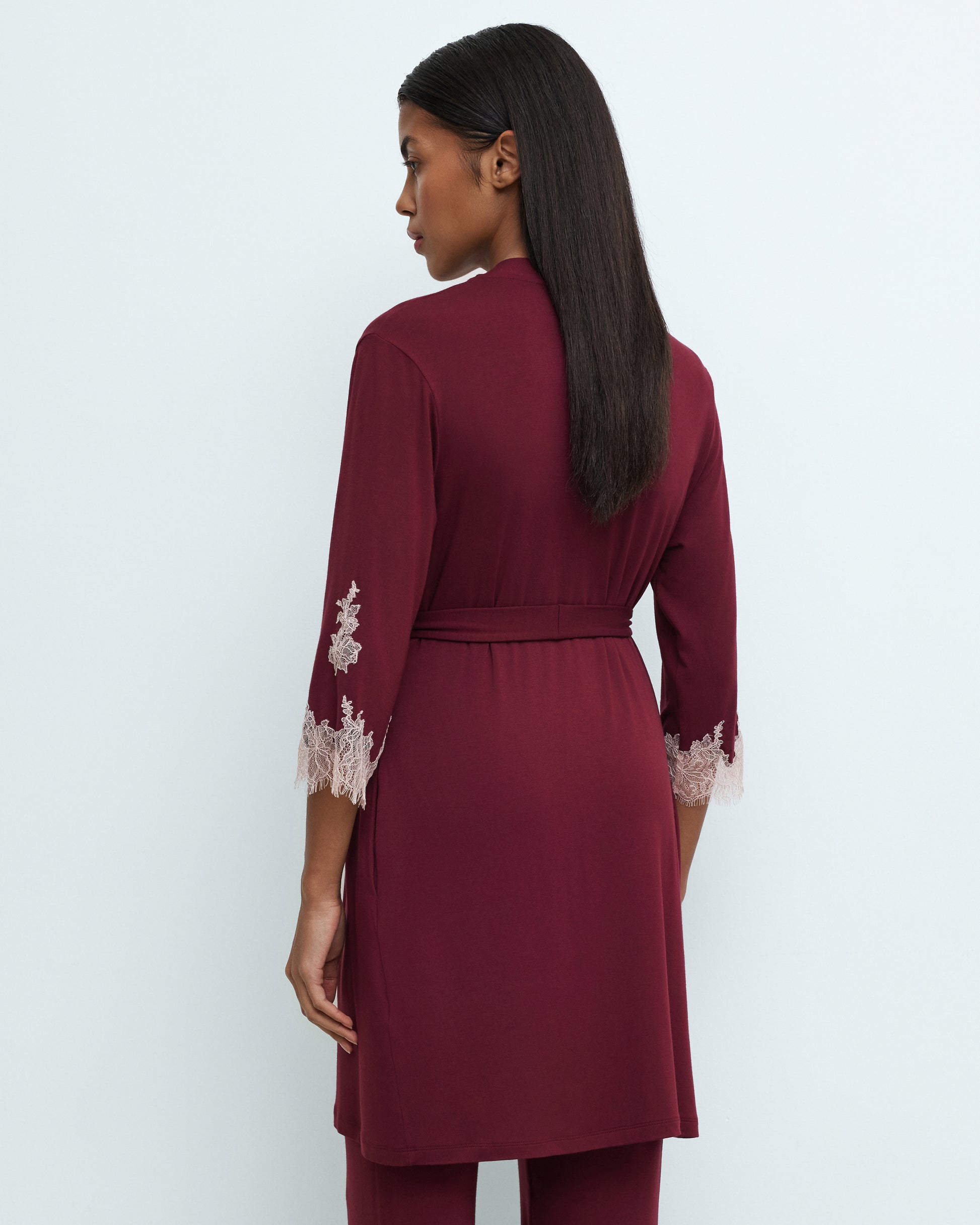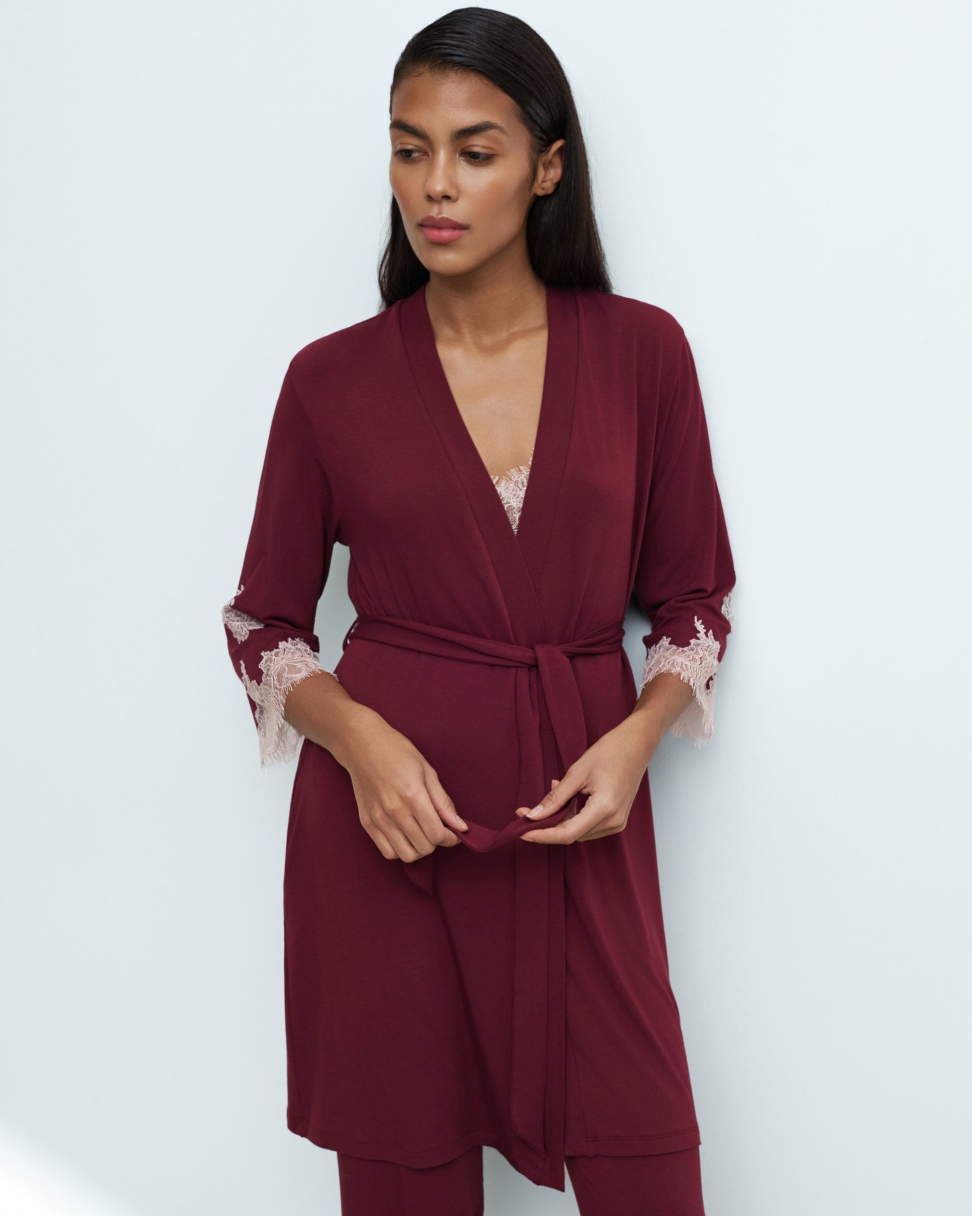 Elegant bamboo robe with delicate Chantilly lace inlays, meticulously hand-placed on the wide sleeves. The flowing silhouette, wrap-around design, and soft belt accentuate the waist, creating a sophisticated and effortlessly feminine look.